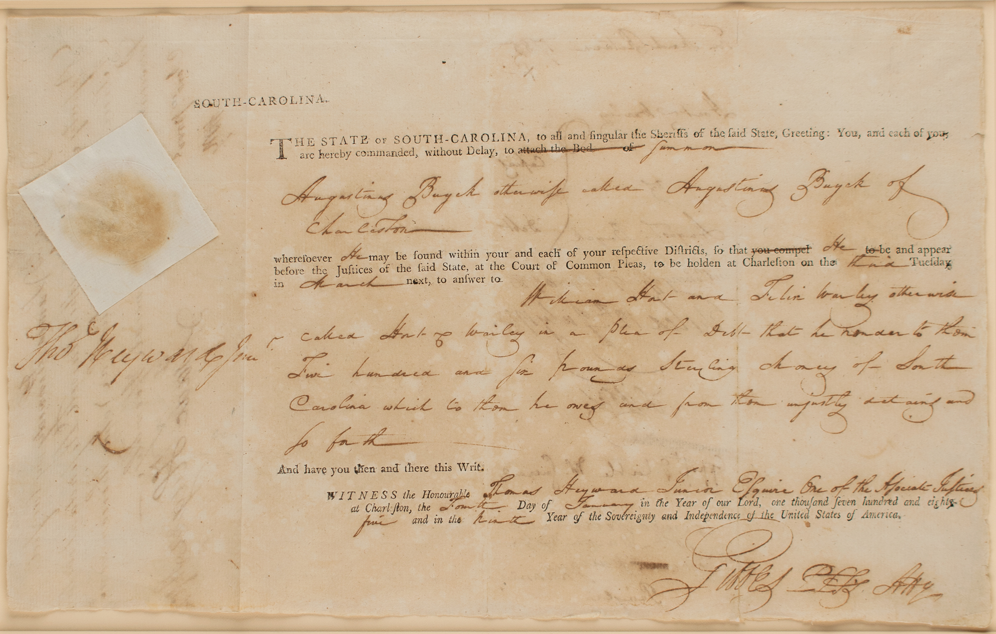 Signer of the Declaration of Independence from South Carolina (1746-1809) who was taken prisoner by the British during the siege of Charleston and held for about a year. Partly-printed DS, signed “Tho's Heyward Jun'r,” one page, 13 x 8.25, January 4, 1785. Order issued in South Carolina, ordering that Augustinus Buyck be compelled to "be and appear before the Justices of the said State, at the Court of Common Pleas?to answer to William Hart and Felix Warby?in a plea of debt that he render to them Five hundred and six pounds Sterling money of South Carolina." Signed by Heyward in the upper left by below the original white paper seal. Archivally mounted, matted, and framed to an overall size of 19.75 x 15. In very good to fine condition, with somewhat irregular overall toning.
