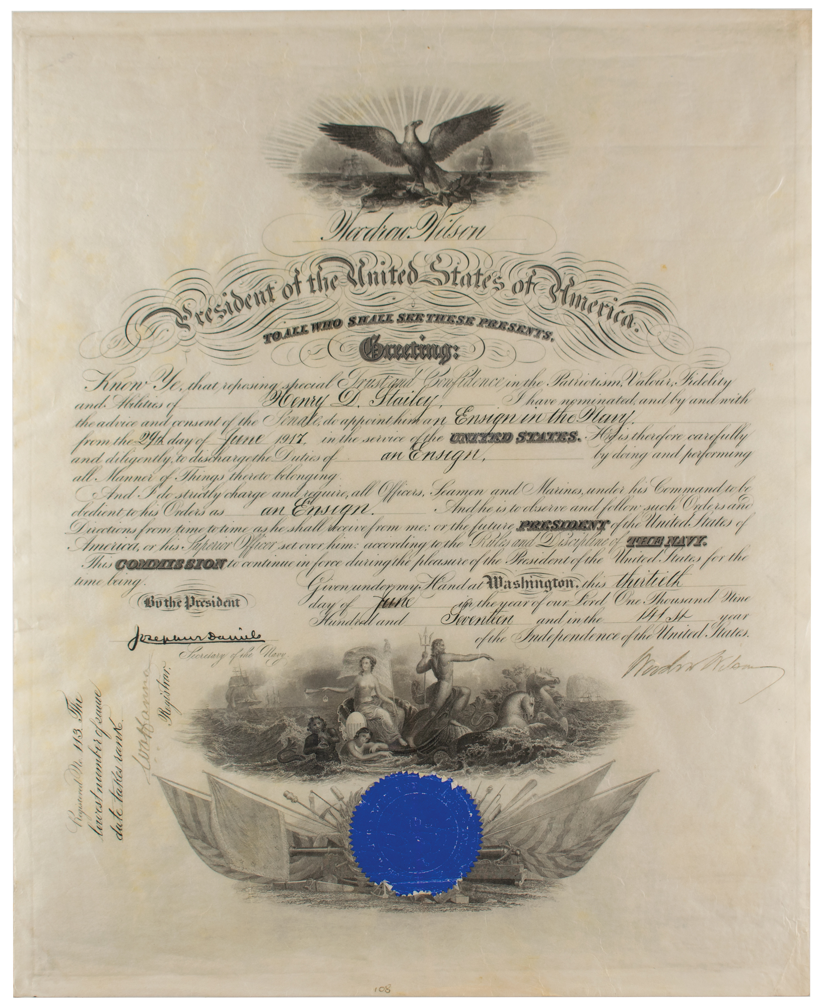 World War I-dated partly-printed vellum DS as president, one page, 15.75 x 19.75, June 30, 1917. President Wilson appoints Henry D. Stailey as an "Ensign in the Navy?in the service of the United States." Signed at the conclusion by Woodrow Wilson, and countersigned by Secretary of the Navy Josephus Daniels. The original blue Navy seal remains affixed to the lower vignette. In fine condition.