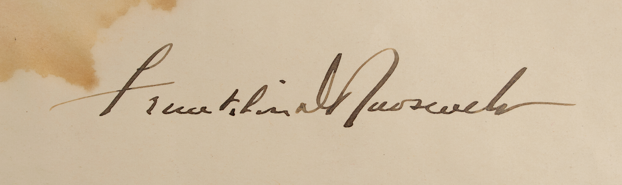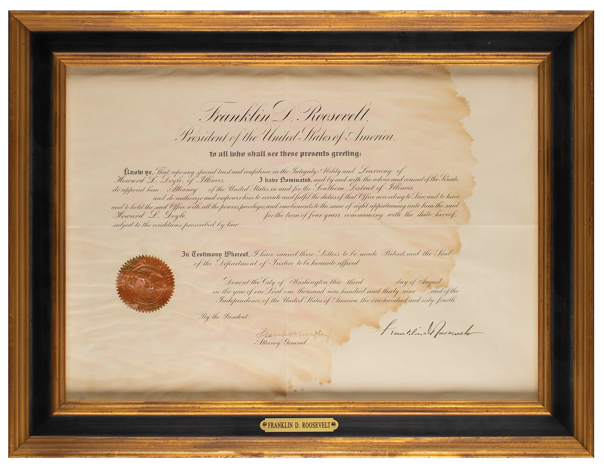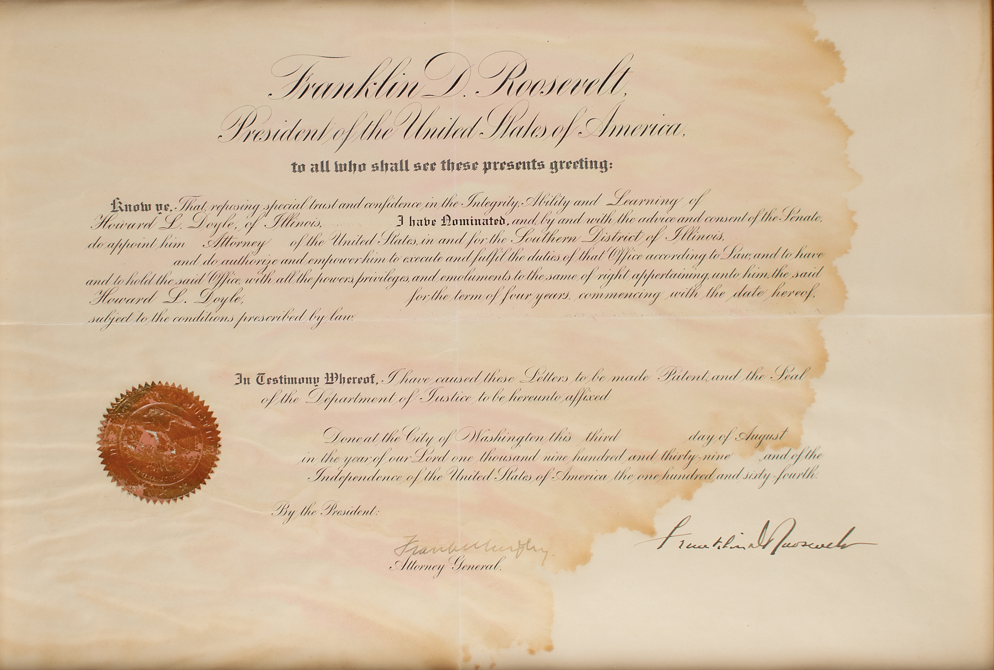 Partly-printed DS as president, one page, 18 x 13, August 3, 1939. President Roosevelt appoints Howard L. Doyle of Illinois an "Attorney of the United States in and for the Southern District of Illinois." Signed boldly at the conclusion by Franklin D. Roosevelt, and countersigned by Attorney General Frank Murphy. Original Department of Justice seal remains affixed to the lower lower left. Archivally framed to an overall size of 22.5 x 17. In very good to fine condition, with obvious staining over much of the document, affecting appearance, but not FDR's bold signature.