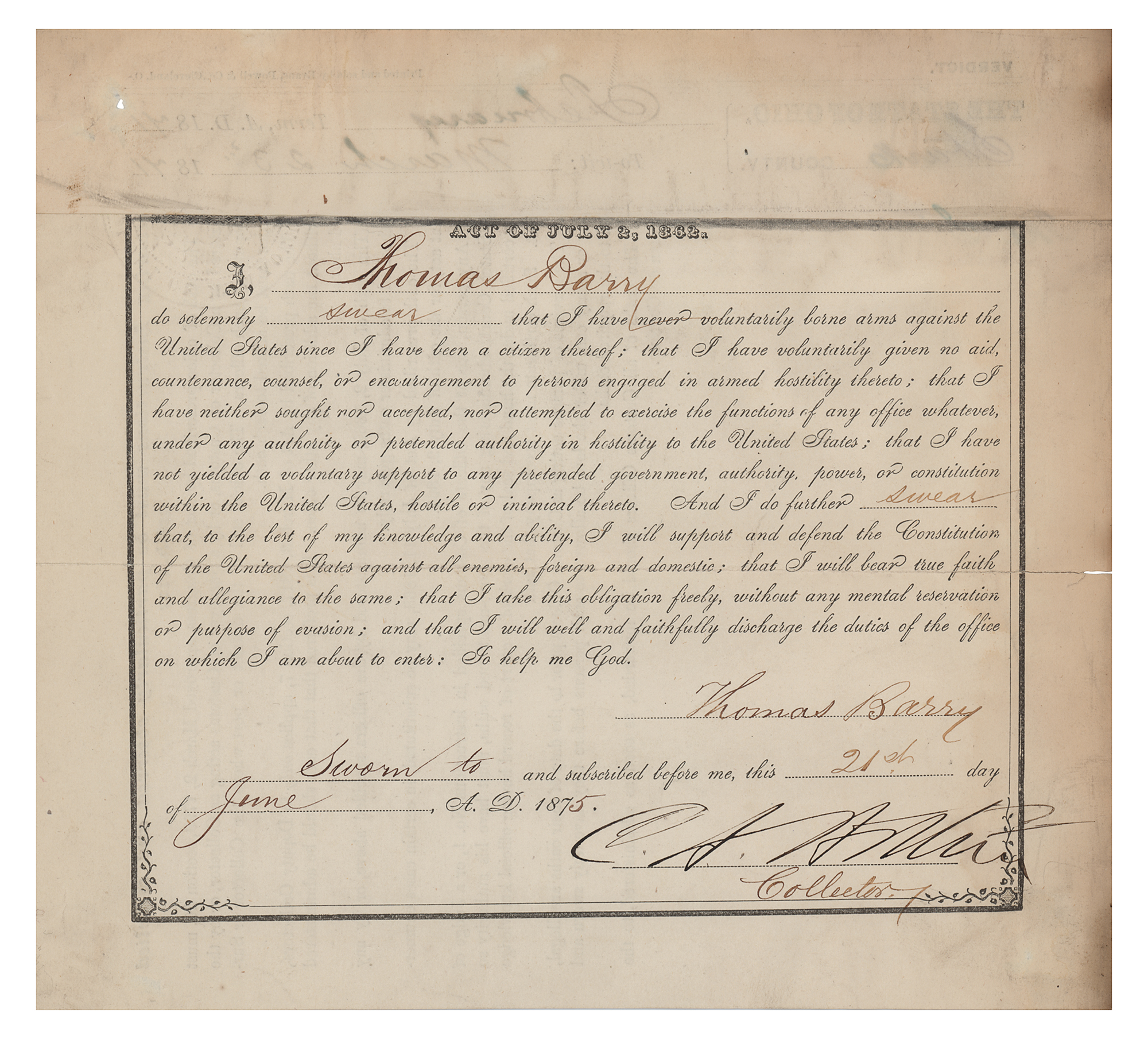 Partly-printed DS, signed “C. A. Arthur,” one page, 8.25 x 7.5, June 21, 1875. Loyalty oath sworn before Arthur, in part: "I, Thomas Barry, do solemnly swear, that I have never voluntarily borne arms against the United States since I have been a citizen thereof?I do further swear that, to the best of my knowledge and ability, I will support and defend the Constitution of the United States against all enemies, foreign and domestic." Boldly signed at the conclusion by Arthur as collector. In very good to fine condition, with toning, soiling, a small hole to the upper left corner, and splits to ends of the horizontal fold.