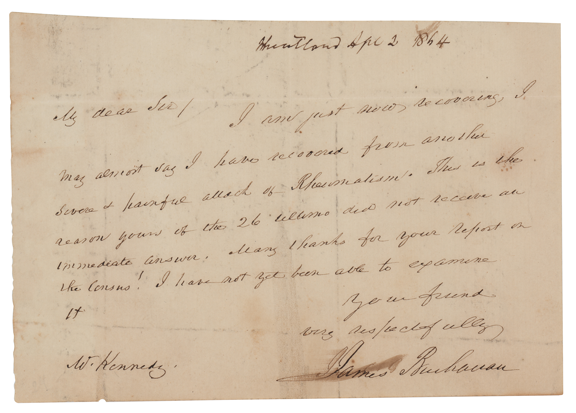 ALS, one page, 6.25 x 4.25, April 2, 1864. Handwritten letter to Mr. Kennedy, in full: "I am just now recovering, I may almost say I have recovered, from another severe & painful attack of Rheumatism. This is the reason yours of the 26 ultimo did not receive an immediate answer. Many thanks for your report on the census! I have not yet been able to examine it." In very good to fine condition, with soiling and scattered stains (one touching Buchanan's first name), and a trimmed top edge.
