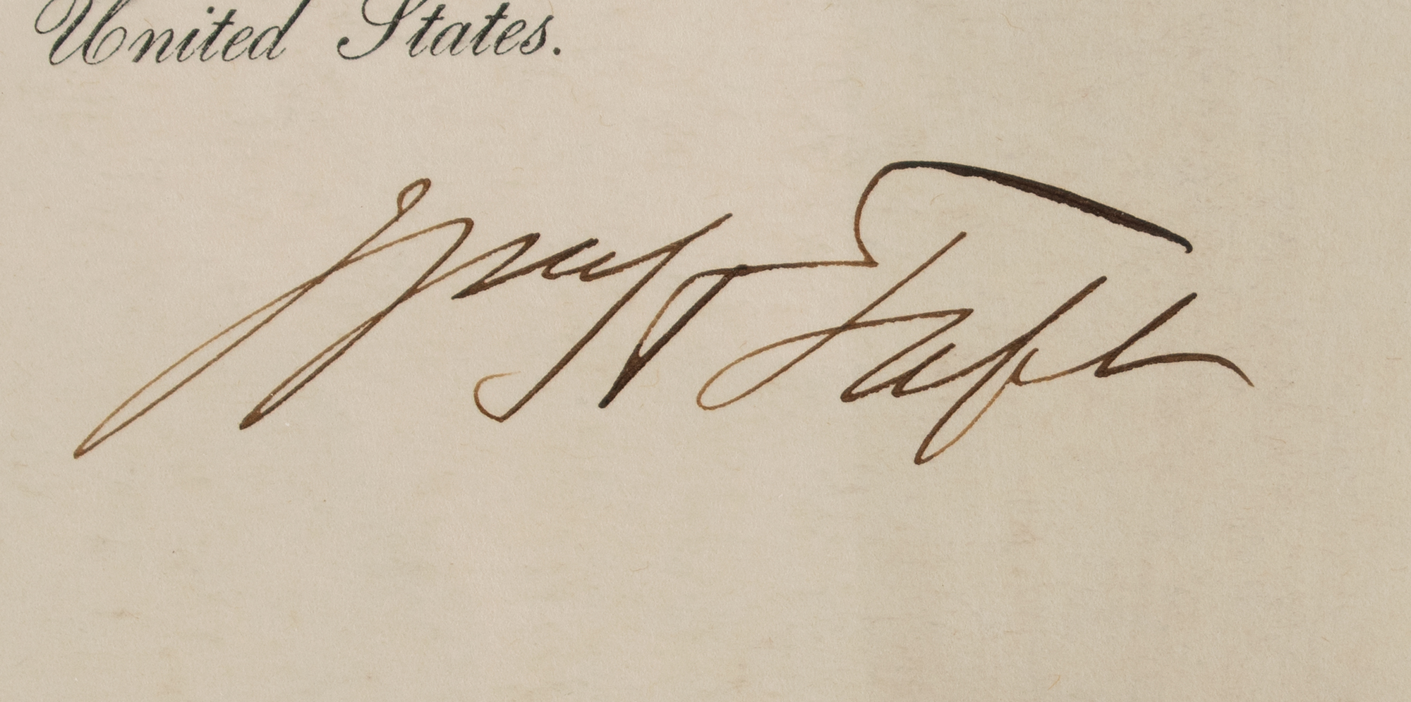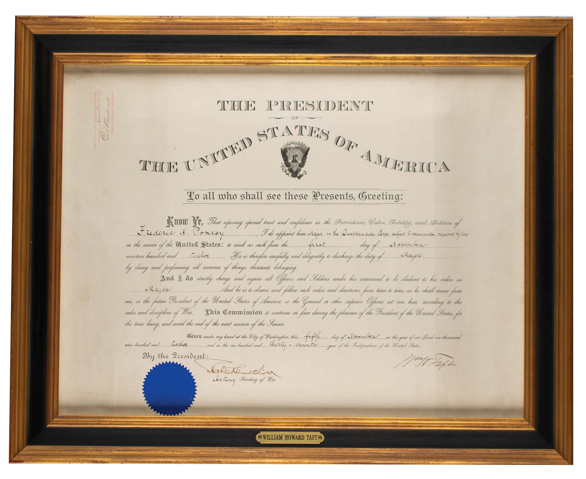 Partly-printed DS as president, signed “Wm. H. Taft,” one page, 20.5 x 15.5, November 5, 1912. President Taft appoints Frederic H. Pomroy as a "Major in the Quartermaster Corps, subject to examination required by law, in the service of the United States." Signed crisply at the conclusion by William H. Taft, and countersigned by Acting Secretary of War Robert Shaw Oliver. The blue War Office seal remains affixed to the lower left. Archivally framed to an overall size of 24.75 x 19.75. In very good to fine condition, with creasing to the side edges.