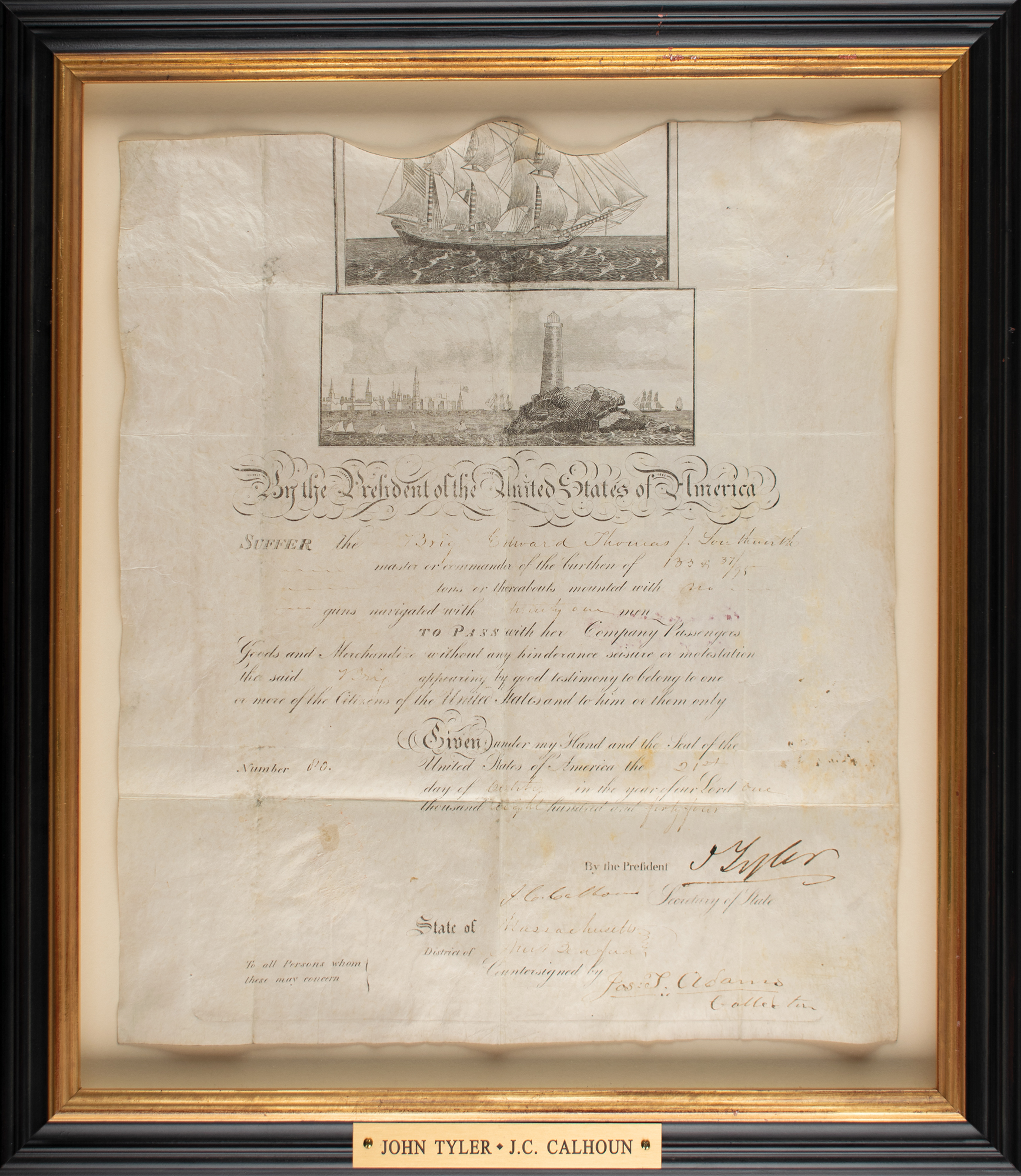 Sought-after partly-printed vellum DS, signed “J. Tyler" as president and "J. C. Calhoun" as secretary of state, one page, 12.75 x 15.5, October 21, 1844. Scalloped-top ship's pass issued to the "Brig Edward, Thomas J. Southworth master or commander of the burthen of 133 37/95 tons or thereabouts mounted with no guns navigated with twenty one men." Signed at the conclusion by President John Tyler, and countersigned below by Secretary of State John C. Calhoun and Collector of Customs Joseph T. Adams. The embossed seal is no longer present. Archivally mounted and framed to an overall size of 17 x 19.5. In fine condition, with scattered small stains.