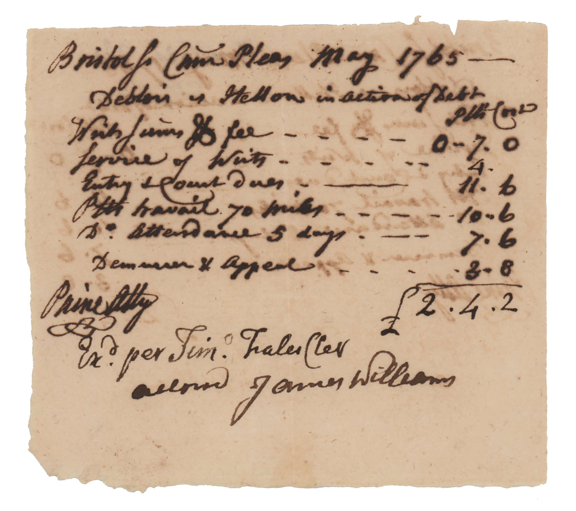 Massachusetts lawyer (1731-1814) who served as one of the prosecutors of British soldiers during the Boston Massacre trial; he later signed the Declaration of Independence. ADS, signed "Paine Atty," one page, 3.75 x 3.25, May 1765. Handwritten bill for his legal services in the amount of £2.4.2, including charges for "service of writs," "entry & court dues," and "attendance 5 days." In fine condition.