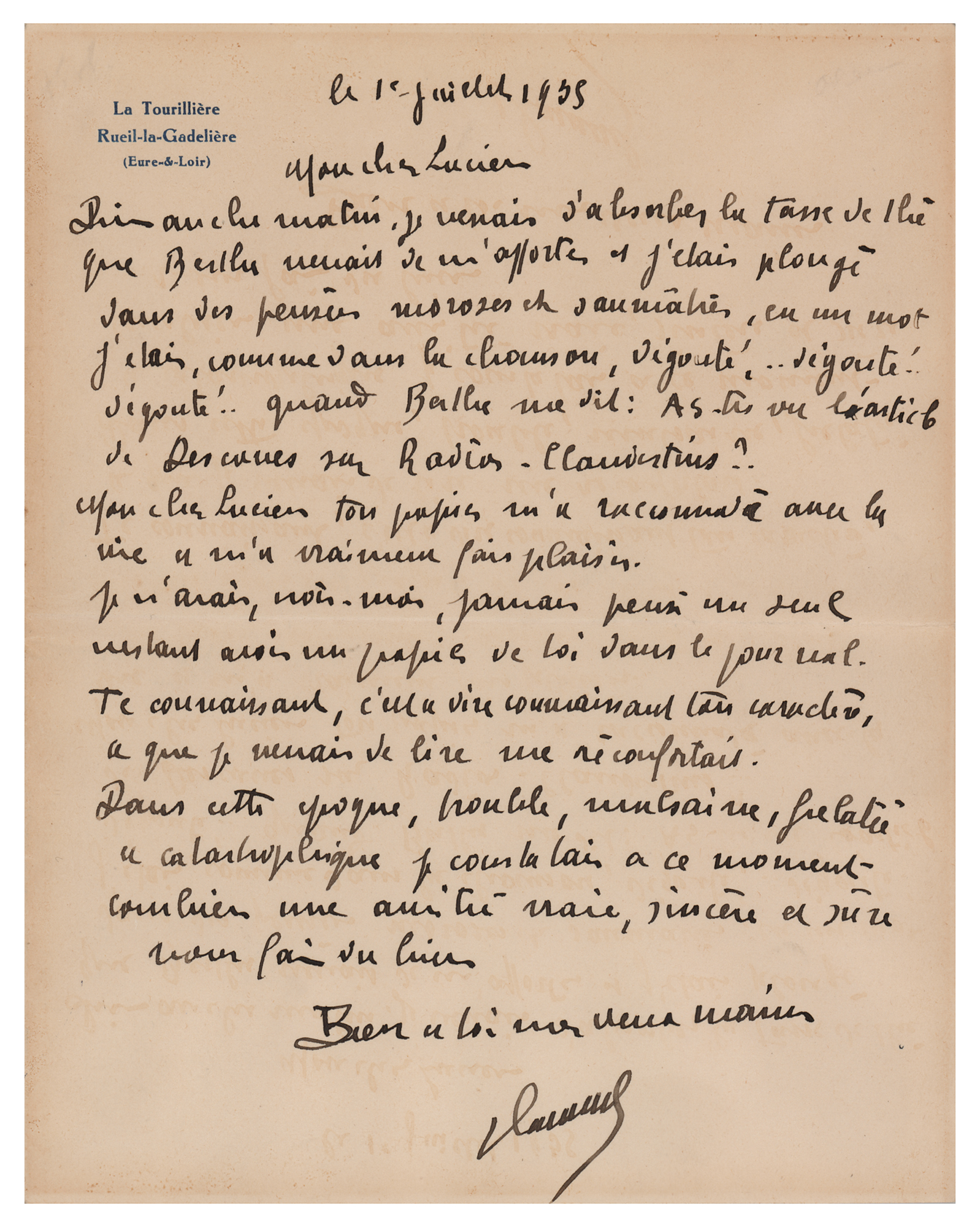 ALS signed “Vlaminck,” one page, 6 x 7.5, La Tourilliere letterhead, July 1, 1935. Handwritten letter to novelist Lucien Descaves, in part (translated): "Sunday morning I had just finished drinking the cup of tea Berthe had brought me and I was deep in gloomy and distressing thoughts: I was, like the song, disgusted—disgusted—disgusted—when Berthe said: 'Did you see the article of Descaves on Radio-Clandestins? My dear Lucien, your paper has reconciled me with life, and I really loved it…In this dim, sickening, adultered and catastrophic epoch of outs, I suddenly felt how much good can come out of a real, sincere and sure friendship." In fine condition, with light toning from prior display.