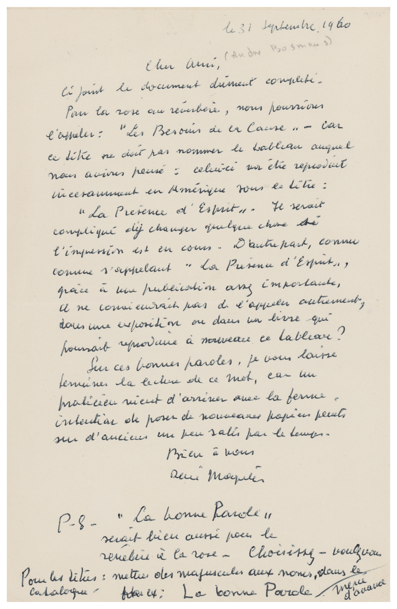 ALS in French, one page, 5.25 x 8, September 31, 1960. Letter to a friend regarding the titles of artworks, in part (translated): "Enclosed herewith is the document duly filled out. We could name the streetlight with a rose 'The Necessities of the Cause'—because the title must not name the picture we had thought of: it has to be reproduced in America under the title 'The Presence of Mind.' It could be complicated to change anything now that the printing is in progress. Besides, known as 'The Presence of Mind' thanks to important publicity, wouldn't it be difficult to call the painting anything else for an art show or in a book that would again reproduce the picture?…P.S. 'The Good Word' would also work quite well for the streetlight with the rose. You choose. Do you want to upper case the words for the titles in the catalogue?" In fine condition.