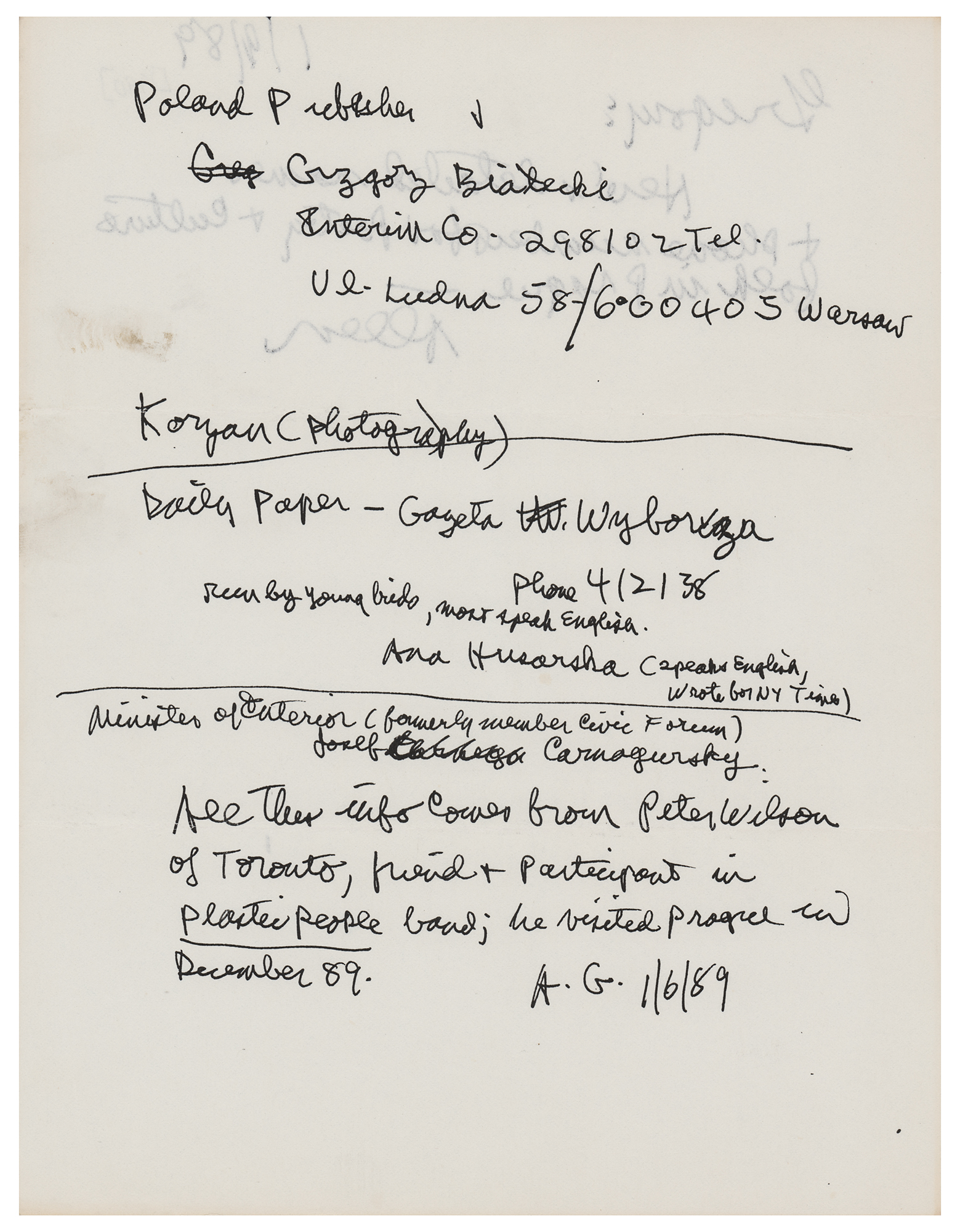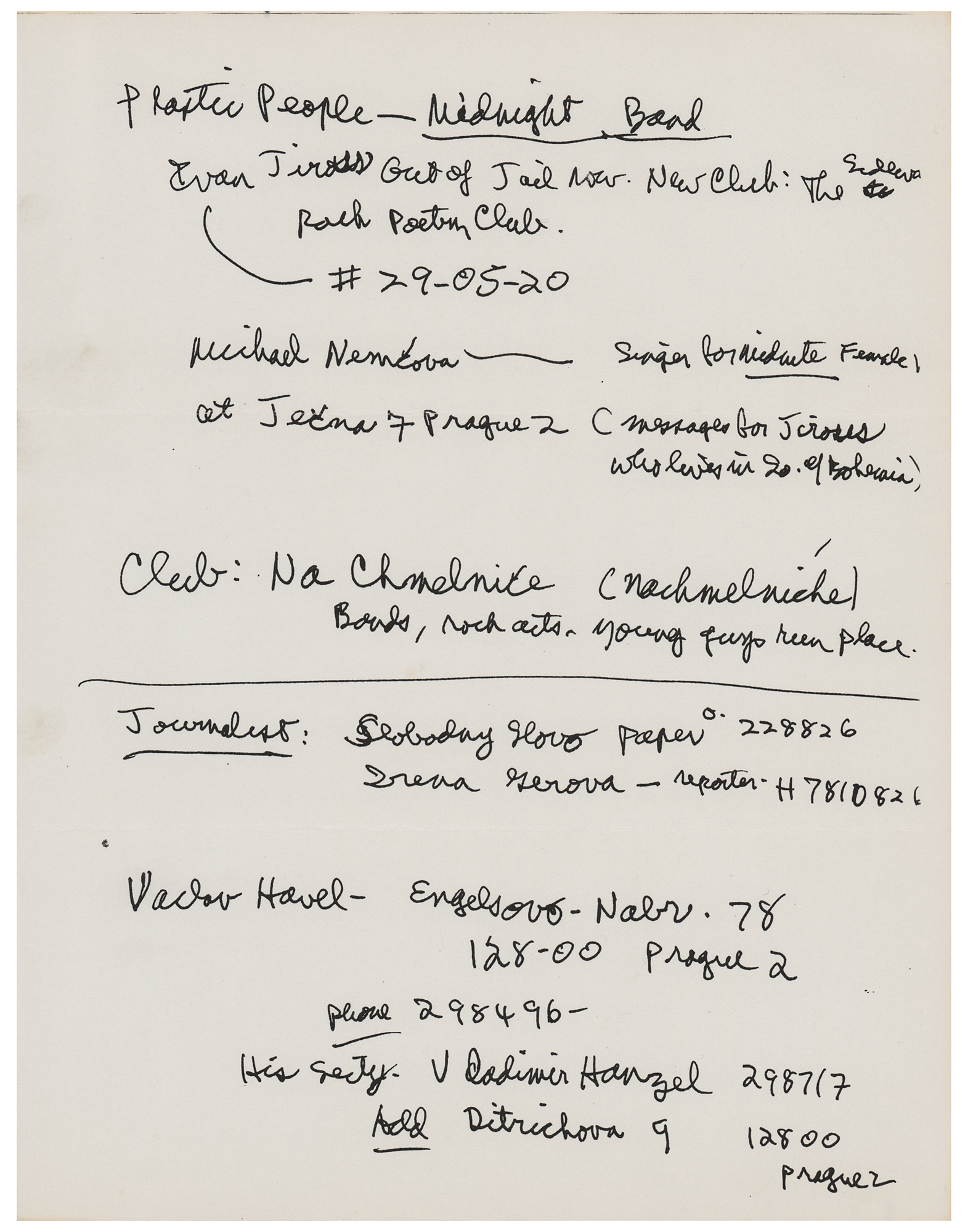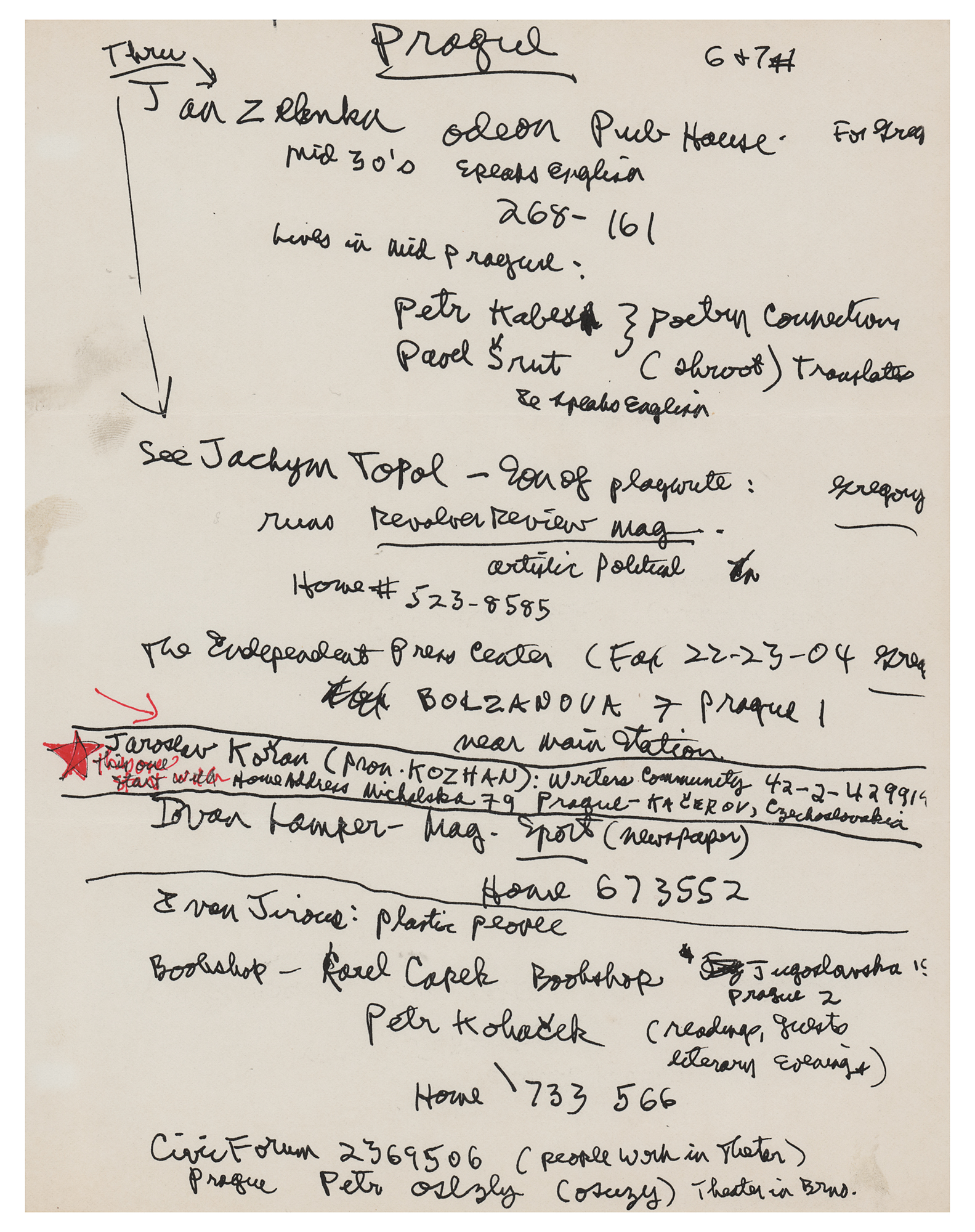 ANS signed “Allen,” one page, 8.5 x 11, January 9, 1989. Note to "Gregory," written on the reverse of a three-page photocopied list of contact info for artistic people in Prague. In full: "Here's detailed names & phone numbers for poetry and culture folk in Prague." The list, photocopied from one originally handwritten by Ginsberg, includes the likes of poet Jachym Topol, translator Jaroslav Koran, the Karel Capek Bookshop, and writer-statesman Vaclav Havel. In fine condition, with scattered fingerprint impressions.