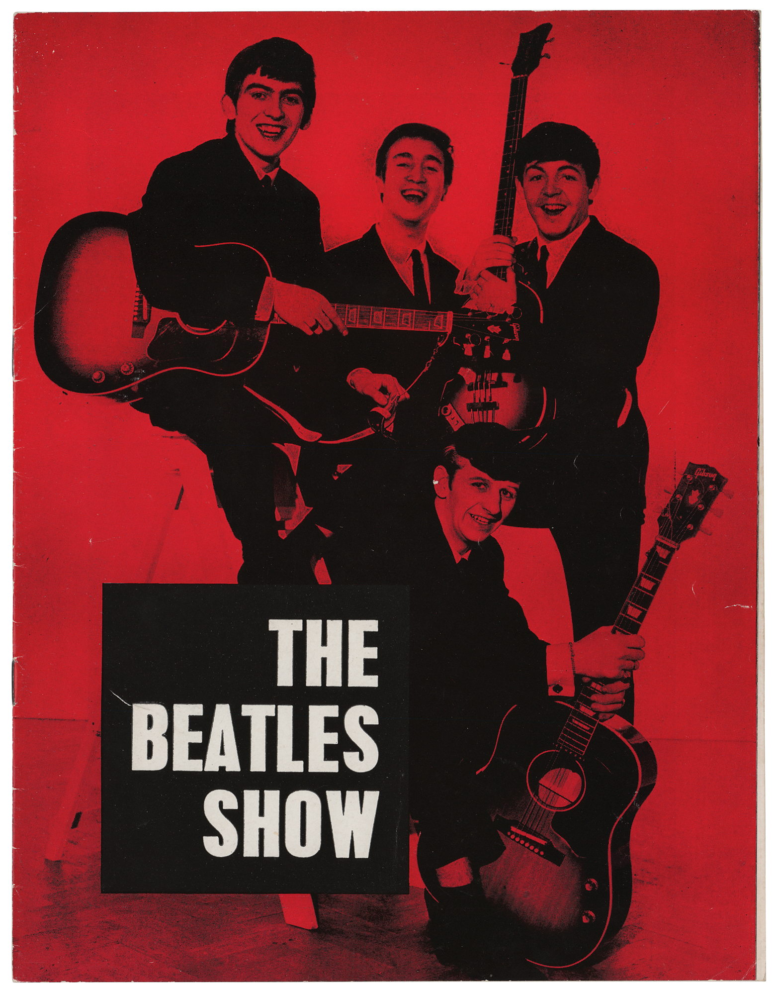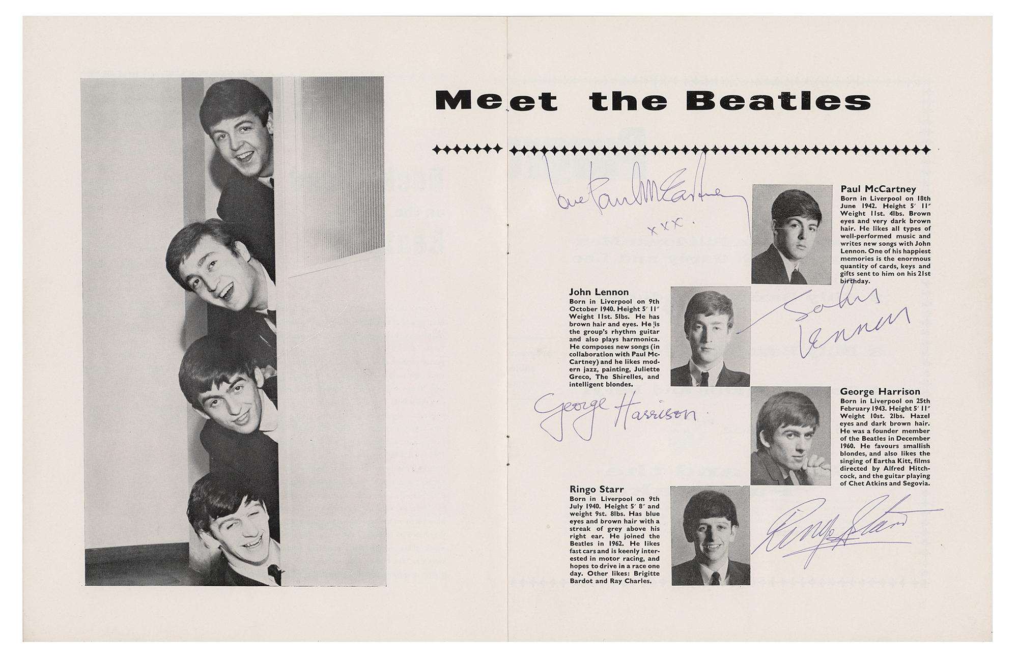 The Beatles Show 'vintage red’ program for performances held at the Odeon Cinema in Southport, England, between August 26-31, 1963, measures 8 x 10.5, twelve pages, signed inside on the "Meet the Beatles" section next to their respective images in blue ballpoint, "George Harrison," "Love, Paul McCartney, xxx," "Ringo Starr," and "John Lennon." The program is also signed inside by four members of Gerry and the Pacemakers: Gerry Marsden, Freddie Marsden, Les Chadwick, and Les Maguire. In fine condition, with light handling wear. Accompanied by a letter of authenticity from noted Beatles expert Frank Caiazzo, who states: “These signatures were obtained at the time of the engagement in Southport, and are as nice as they could have signed on that day—they are flawless and stunning examples, making this one of the nicest signed Beatles show programs in existence.”