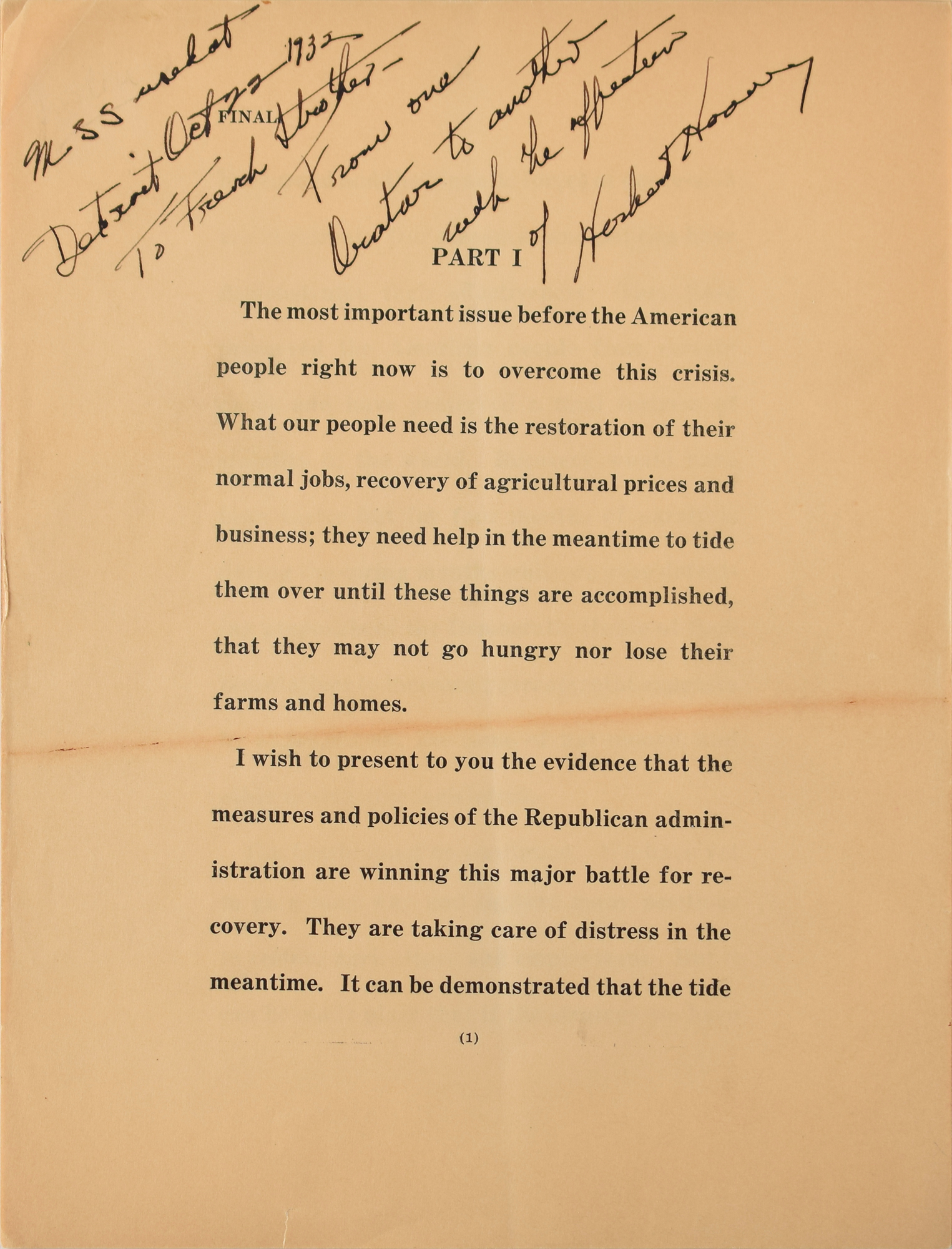 President Hoover gave this speech before a crowd 22,000 strong at Detroit's Olympia Arena on October 22, 1932, just two weeks before the presidential election as the nation was gripped by the Great Depression. He blamed the slow recovery on obstruction by the Democratic Party ("Recovery would have been faster but for four months of paralysis during the spring months while we were defeating proposals of the Democratic House of Representatives"), and assured his large audience that sure signs of rebound were beginning to manifest themselves under his guidance. Voters remained unconvinced, and on election day Hoover fell to Franklin D. Roosevelt in a landslide, carrying only six states to FDR's 42.