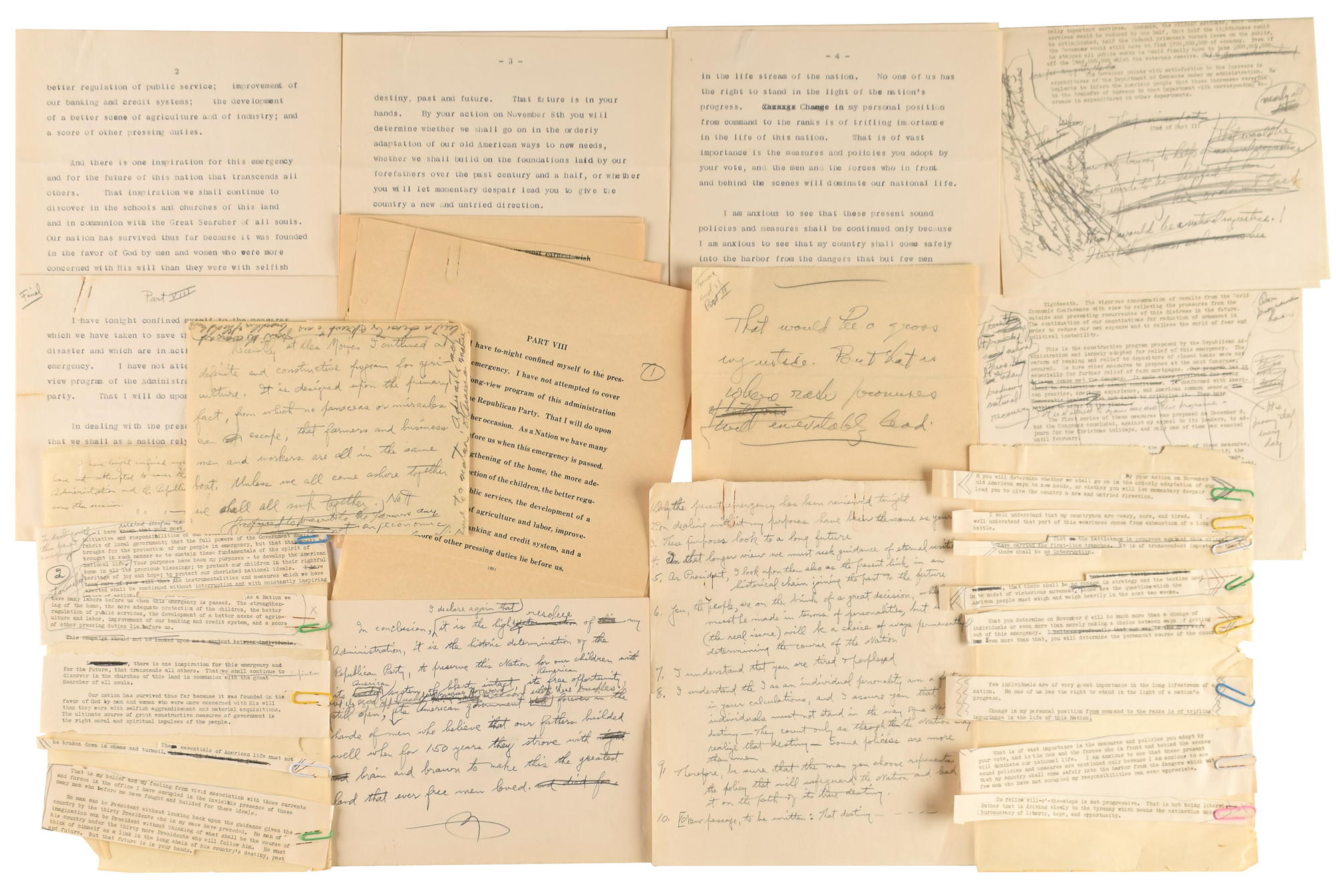 Printed reading copy of his speech 'The Success of Recovery' used during his campaign as the incumbent president in 1932, 75 pages, signed and inscribed on the first page in fountain pen to his personal secretary, "MSS used at Detroit, Oct. 22, 1932, To French Strother—From one Orator to another, with the affection of Herbert Hoover." Includes approximately ten pages of handwritten notes, composition fragments, and corrections made in pencil by Hoover, plus mimeographed additions. Hoover outlines the contents of his speech at the beginning: "I wish to present to you the evidence that the measures and policies of the Republican administration are winning this major battle for recovery?It can be demonstrated that the tide has turned and the gigantic forces of depression are in retreat. Our measures and policies have demonstrated their effectiveness. They have preserved the American people from certain chaos and have preserved a final fortress of stability in the world." Includes the original White House transmittal envelope, signed in the upper left in pencil, "From, Herbert Hoover." In overall fine condition.