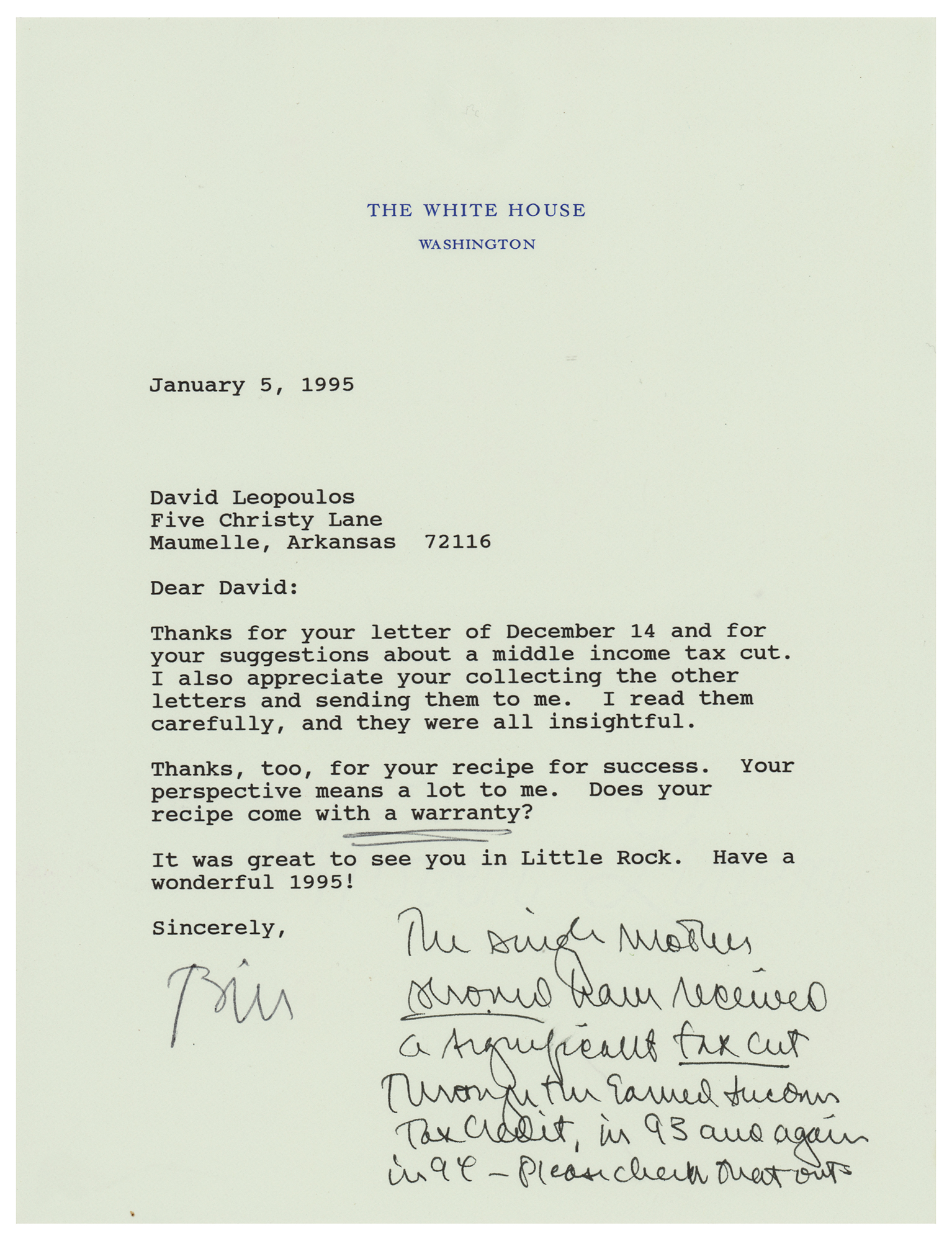 ALS as president, signed “Bill,” one page, 6.75 x 9, White House letterhead, January 5, 1995. Letter to David Leopoulos, in part: "Thanks for your letter of December 14 and for your suggestions about a middle income tax cut?Thanks, too, for your recipe for success. Your perspective means a lot to me. Does your recipe come with a warranty?" President Clinton adds a handwritten postscript: "The single mother should have received a significant tax cut through the Earned Income Tax Credit, in 93 and again in 94—please check that out." In very fine condition.