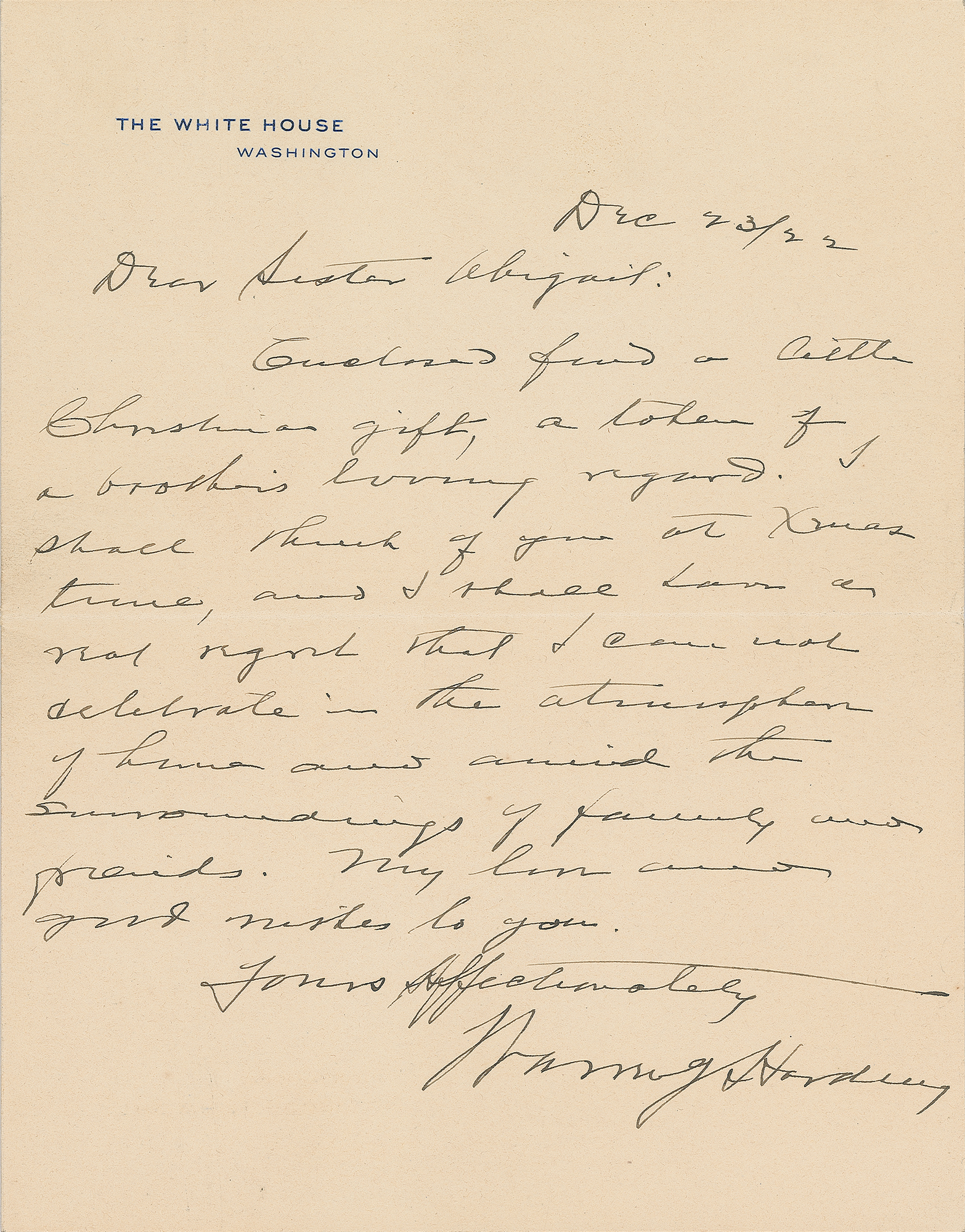 ALS as president, one page, 7 x 9, White House letterhead, December 23, 1922. Handwritten letter to his sister Abigail, in full: "Enclosed find a little Christmas gift, a token of a brother's loving regard. I shall think of you at Xmas time, and I shall have a real regret that I can not celebrate in the atmosphere of home and amid the surroundings of family and friends. My love and good wishes to you." In fine condition. Accompanied by the original White House mailing envelope. A heartfelt missive between siblings that reveals Harding’s disappointment in not being able to spend the holidays with his friends and family back in Ohio; his wife, Florence, had collapsed from kidney failure the September prior and was still confined to a wheelchair. This would be the second and last Christmas Harding celebrated as president. Handwritten letters from Harding as commander-in-chief—especially those bearing familial content— remain exceedingly rare and sought-after.