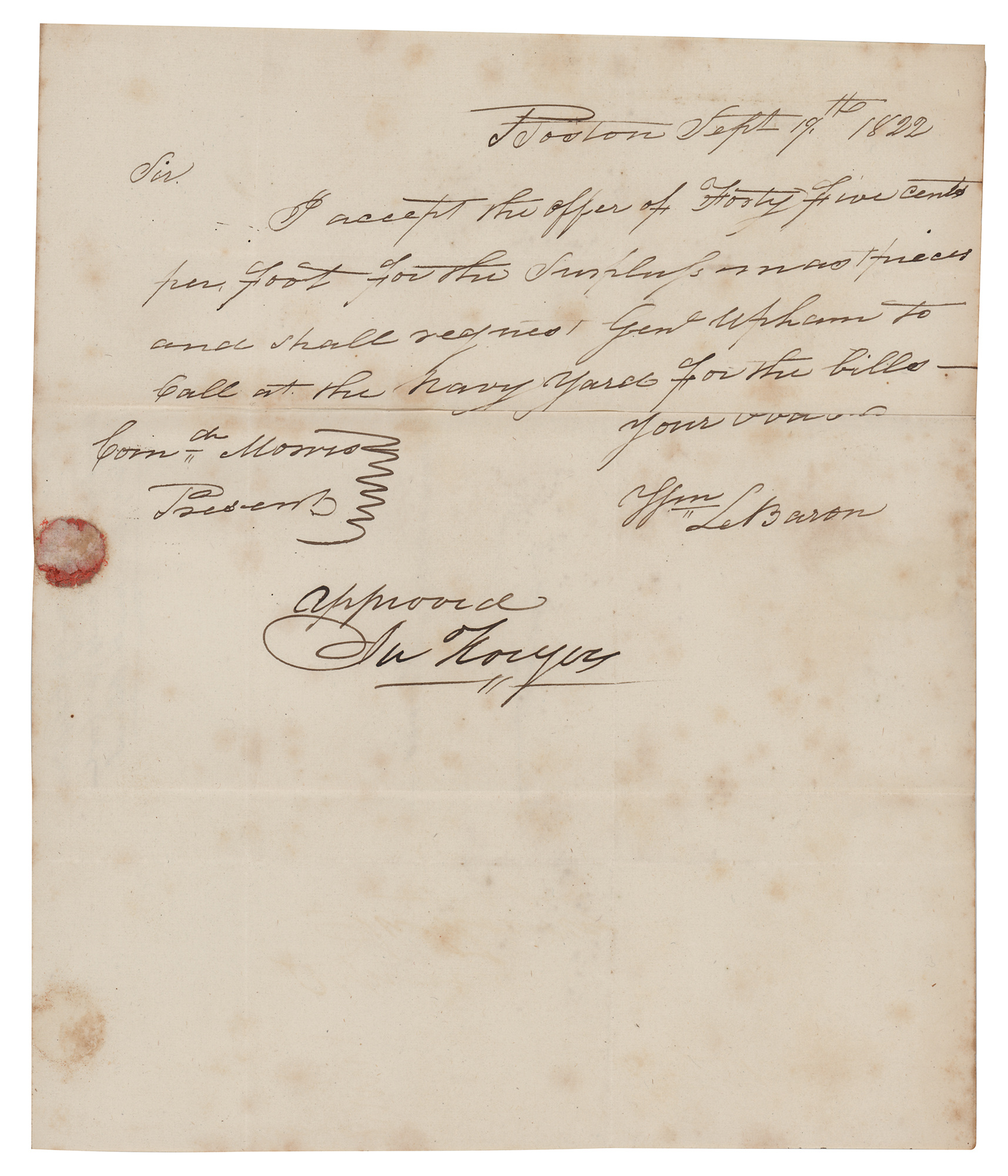Commodore in the US Navy (1772-1838) who served in the Quasi-War with France, both Barbary Wars in North Africa, and the War of 1812 with Britain, and played a major role in the development of the standards, customs, and traditions of the American navy. Autograph endorsement signed “Approved, Jno. Rodgers,” below a letter written to Commodore Morris by William LeBaron, one page, 8.25 x 9.75, September 19, 1822. LeBaron writes, in full: "I accept the offer of Forty five cents per foot for the surplus mast pieces and shall request Gen'l Upham to call at the Navy Yard for the bills." Endorsed at the conclusion by Rodgers. In very good to fine condition, with scattered foxing, and seal-related paper loss to the integral address leaf.