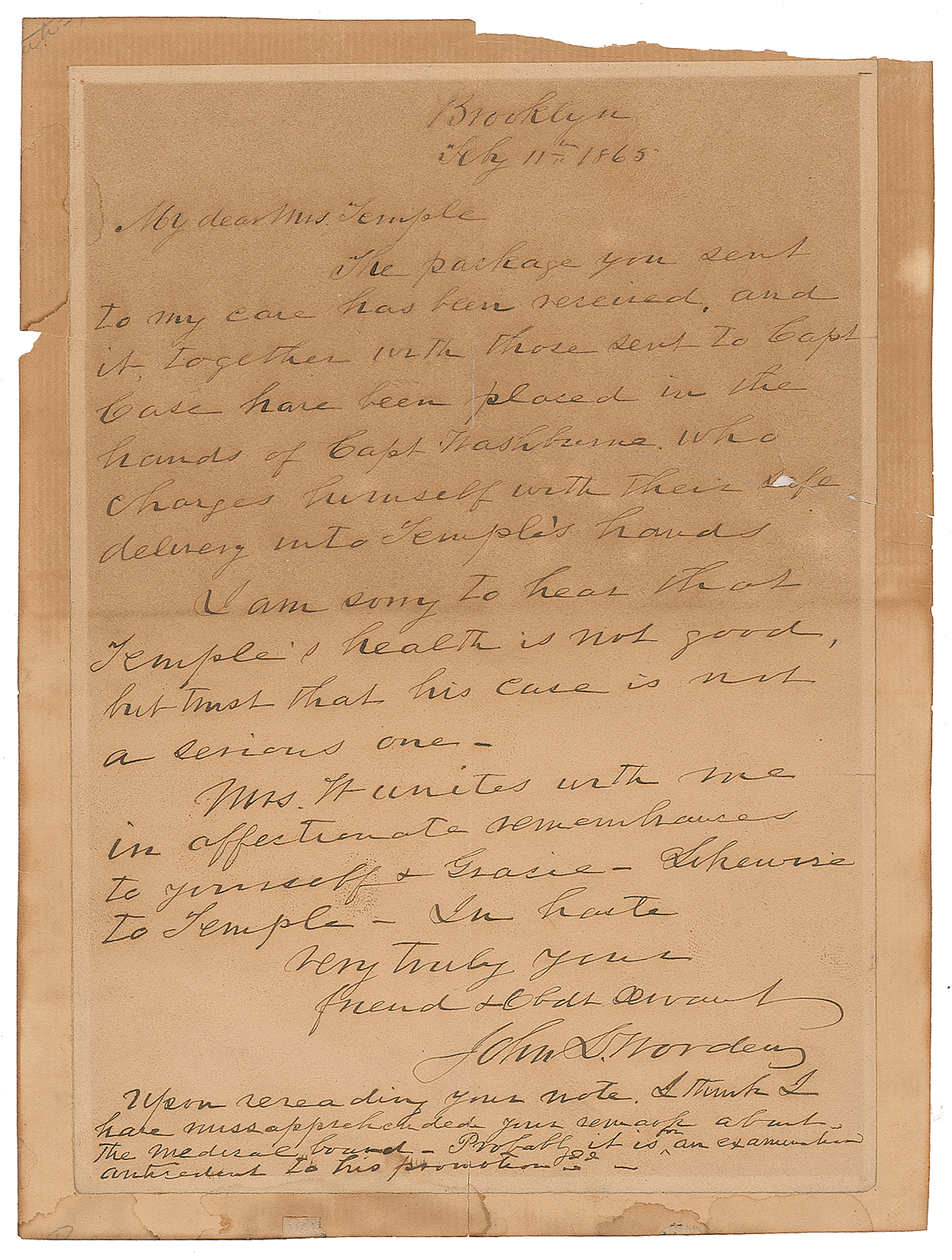 Civil War admiral (1818-1897) who commanded the Monitor against the Merrimack in the first battle of ironclad ships. Civil War-dated ALS, one page, 5.25 x 7.5, February 11, 1865. Letter to "Mrs. Temple," in part: "The package you sent to my care has been received, and it together with those sent to Capt. Case have been placed in the hands of Capt. Washburne?I am sorry to hear that Temple's health is not good, but trust that his case is not a serious one." Affixed to a slightly larger sheet and in very good condition, with toning and staining, some edge loss, and tape repairs to the back of several tears.