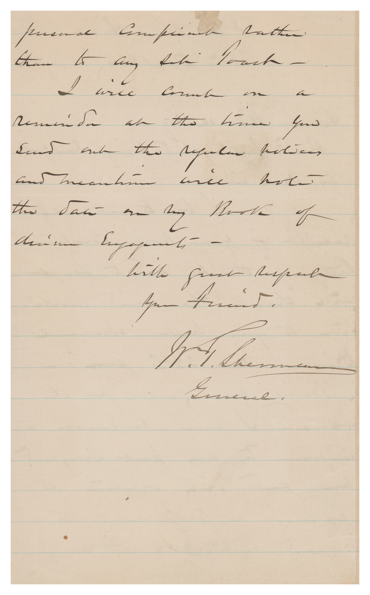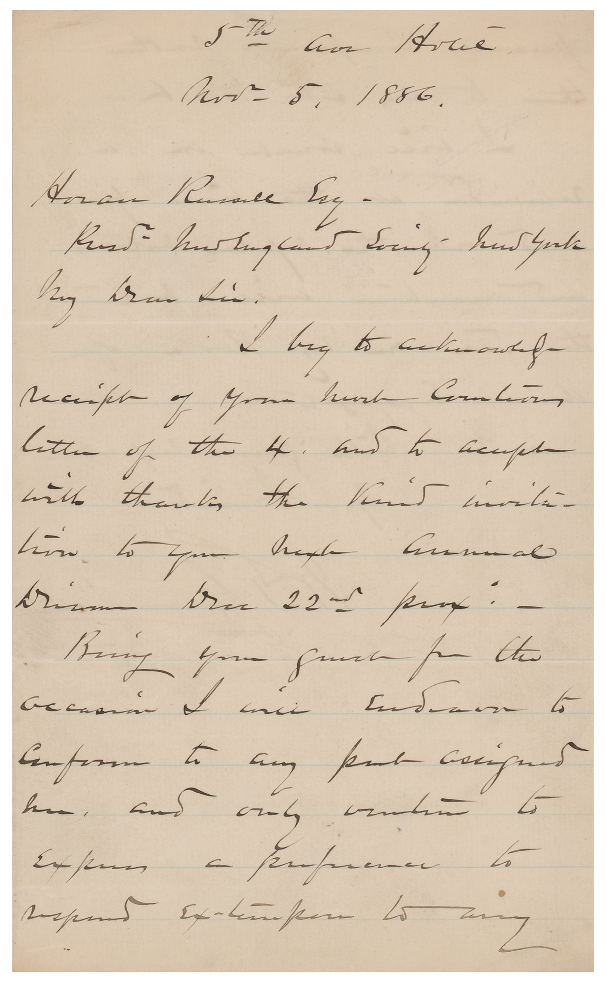 ALS signed “W. T. Sherman, General,” one page both sides, 5.5 x 9, November 5, 1886. Handwritten letter to Horan Russell, accepting "the kind invitation to your next Annual Dinner." In part: "Being your guest for the occasion I will endeavor to conform to any part assigned me, and only venture to express a preference to respond ex-tempore to any personal compliment rather than to any such toast." In fine condition.