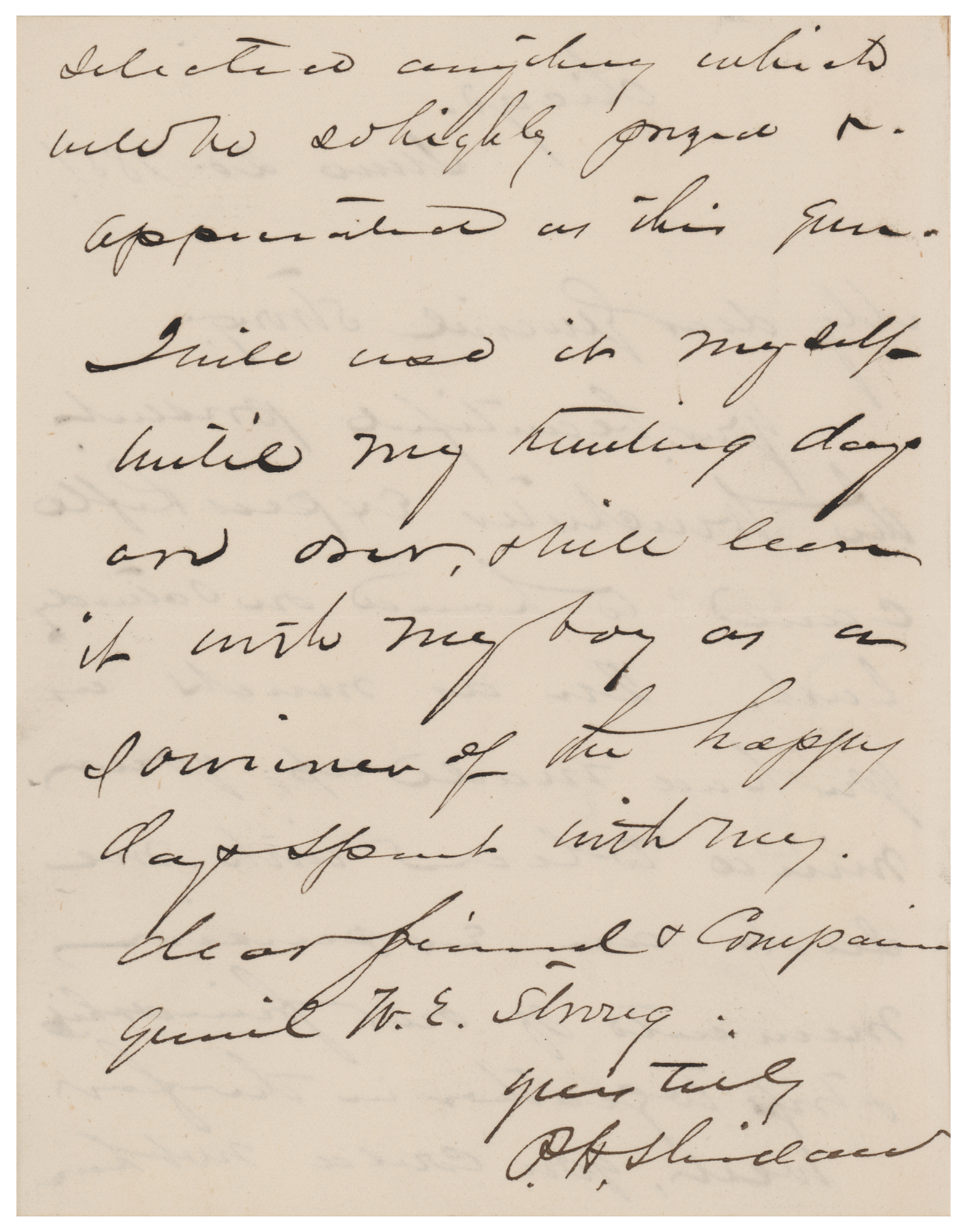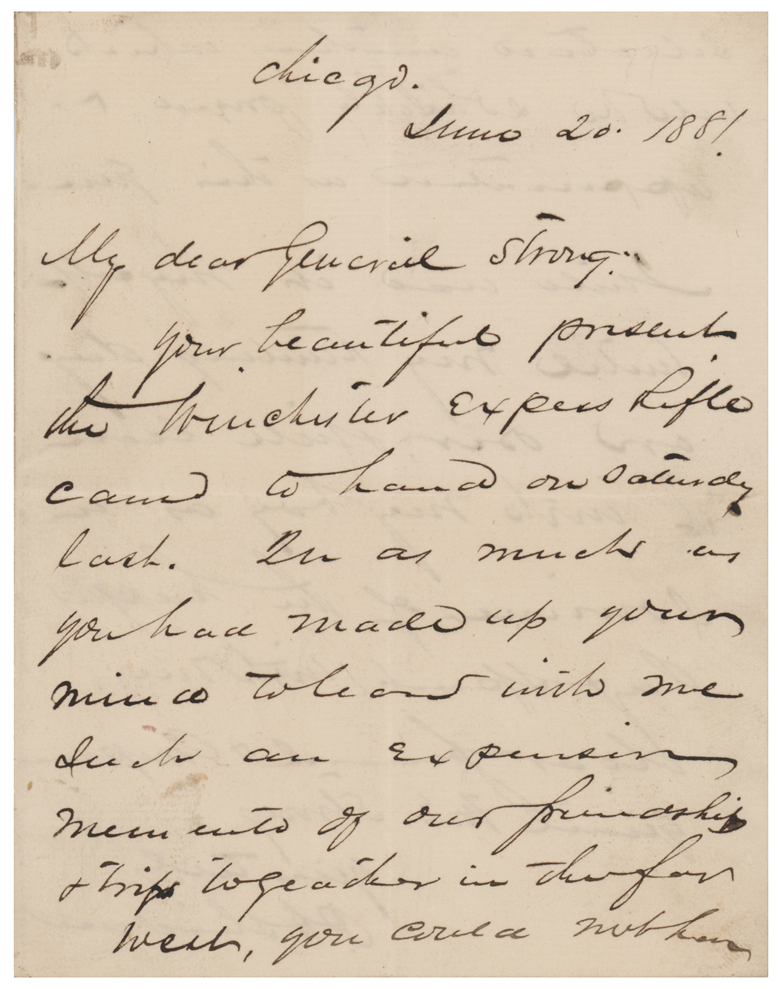 ALS signed “P. H. Sheridan,” one page both sides, 5 x 6.5, June 20, 1881. Handwritten letter to "General Strong," in part: "Your beautiful present the Winchester Express Rifle came to hand on Saturday last. In as much as you had made up your mind to leave with me such an expression?of our friendship & trips together in the far west, you could not have selected anything which will be so highly prized and appreciated as this gun. I will use it myself until my hunting days are over, & will leave it unto my boy as a souvenir of the happy days spent with my very dear friend & companion Gen'l W. E. Strong." In fine condition.