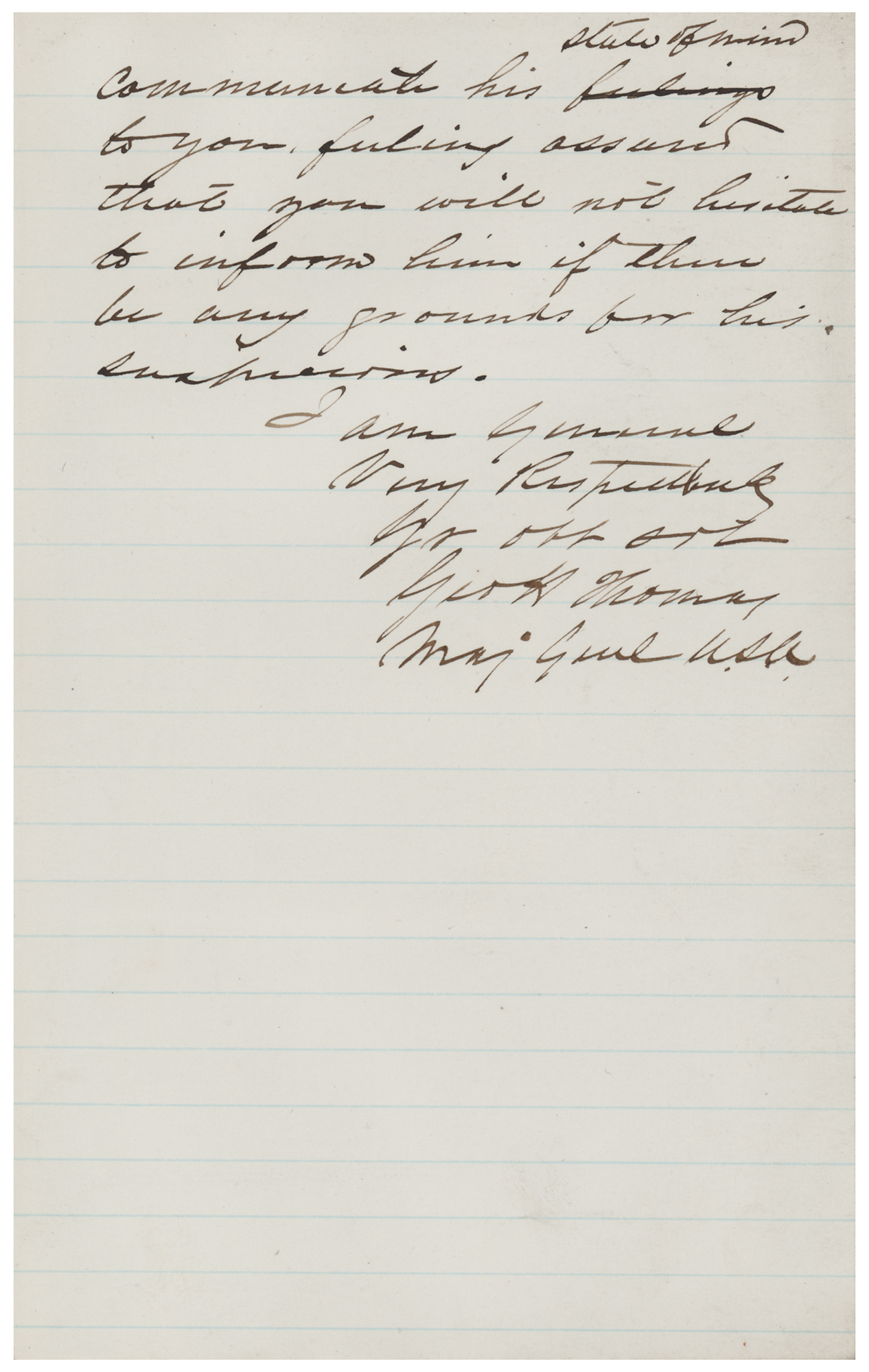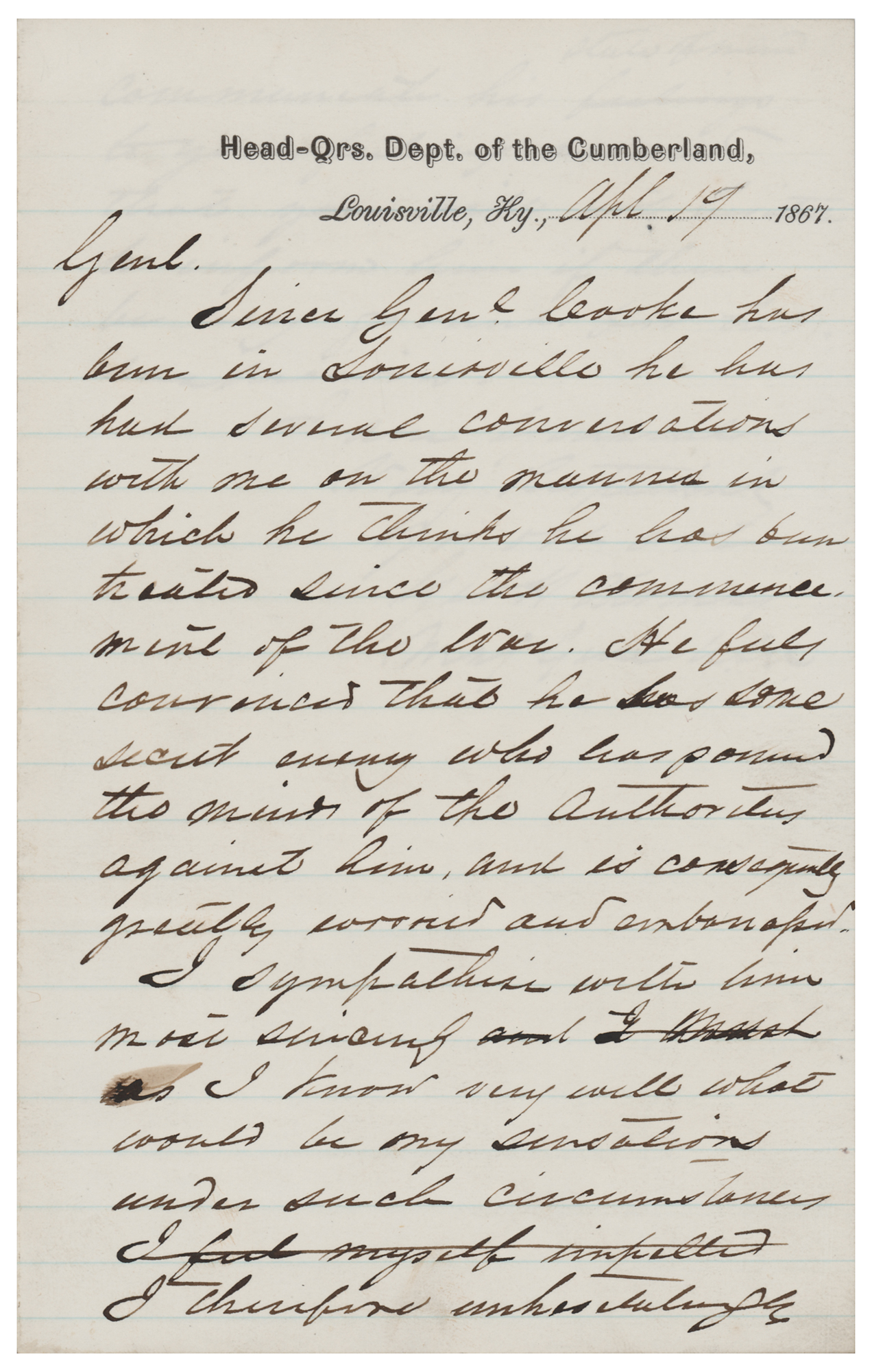 Union general (1816-1870) whose most decisive victory earned him the sobriquet 'Rock of Chickamauga.' ALS signed “Geo. H. Thomas, Maj. Gen'l U.S.A.,” two pages on two adjoining sheets, 5 x 8, Head-Qrs. Dept. of the Cumberland letterhead, April 19, 1867. Handwritten letter to a general, in full: "Since Genl. Cooke has been in Louisville has has had several conversations with me on the manner in which he thinks he has been treated since the commencement of the War. He feels convinced that he has some secret enemy who has poisoned the minds of the Authorities against him, and is consequently greatly worried and embarrassed. I sympathize with him most sincerely as I know very well what would be my sensations under such circumstances. I therefore unhesitatingly communicate his state of mind to you, feeling assured that you will not hesitate to inform him if there be any grounds for his suspicions." In fine condition.