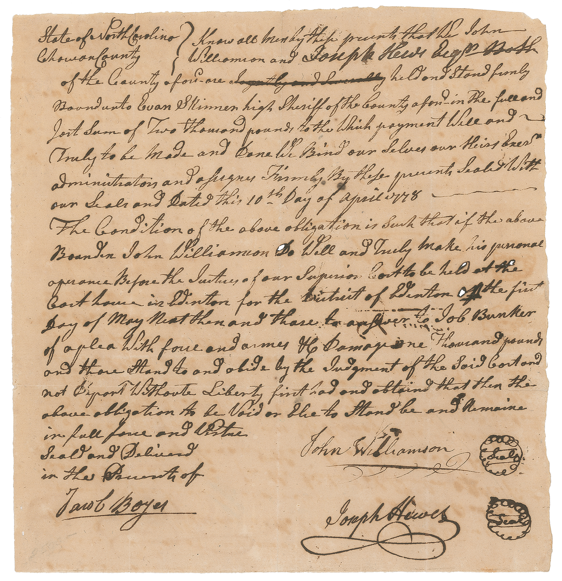 Secretary of the Naval Affairs Committee during the Revolutionary War who signed the Declaration of Independence, one of only three Quakers to do so (1730-1779). Rare Revolutionary war-dated manuscript DS, one page, 8.25 x 8.75, April 10, 1778. Legal document concerning a bail payment, in part: "Know all men by these presents that We John Williamson and Joseph Hews Esqr.…stand firmly Bound unto Evan Skinner high Sheriff…in the full and just sum of Two thousand pounds…The Condition of the above obligation is in such that if the above…John Williamson…make his personal appearance Before the Justices of our Superior Court." In fine condition. Accompanied by a full letter of authenticity from JSA.