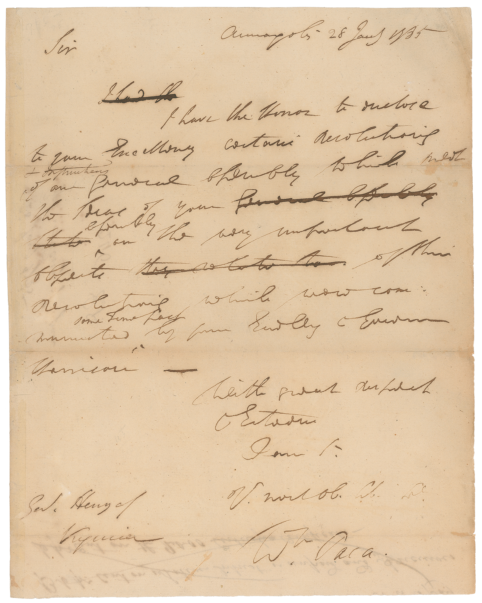 Signer of the Declaration of Independence from Maryland (1740-1799) who served in the Continental Congress from 1778 to 1782. ALS signed “Wm. Paca,” one page, 8 x 10.25, January 28, 1785. As governor of Maryland, Paca drafts a letter to Governor Patrick Henry of Virginia, in full: "I have the Honor to enclose to your Excellency certain resolutions of our General Assembly which hold to the Ideas of your Assembly on the very important objects of their Resolutions which were communicated some Time past by your Governor Harrison." Paca strikes through several words, and makes revisions between the lines. In very good to fine condition, with splitting to the fold ends, and several areas of thin paper.