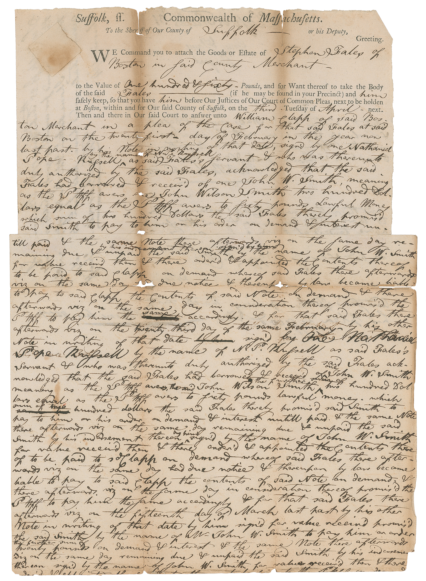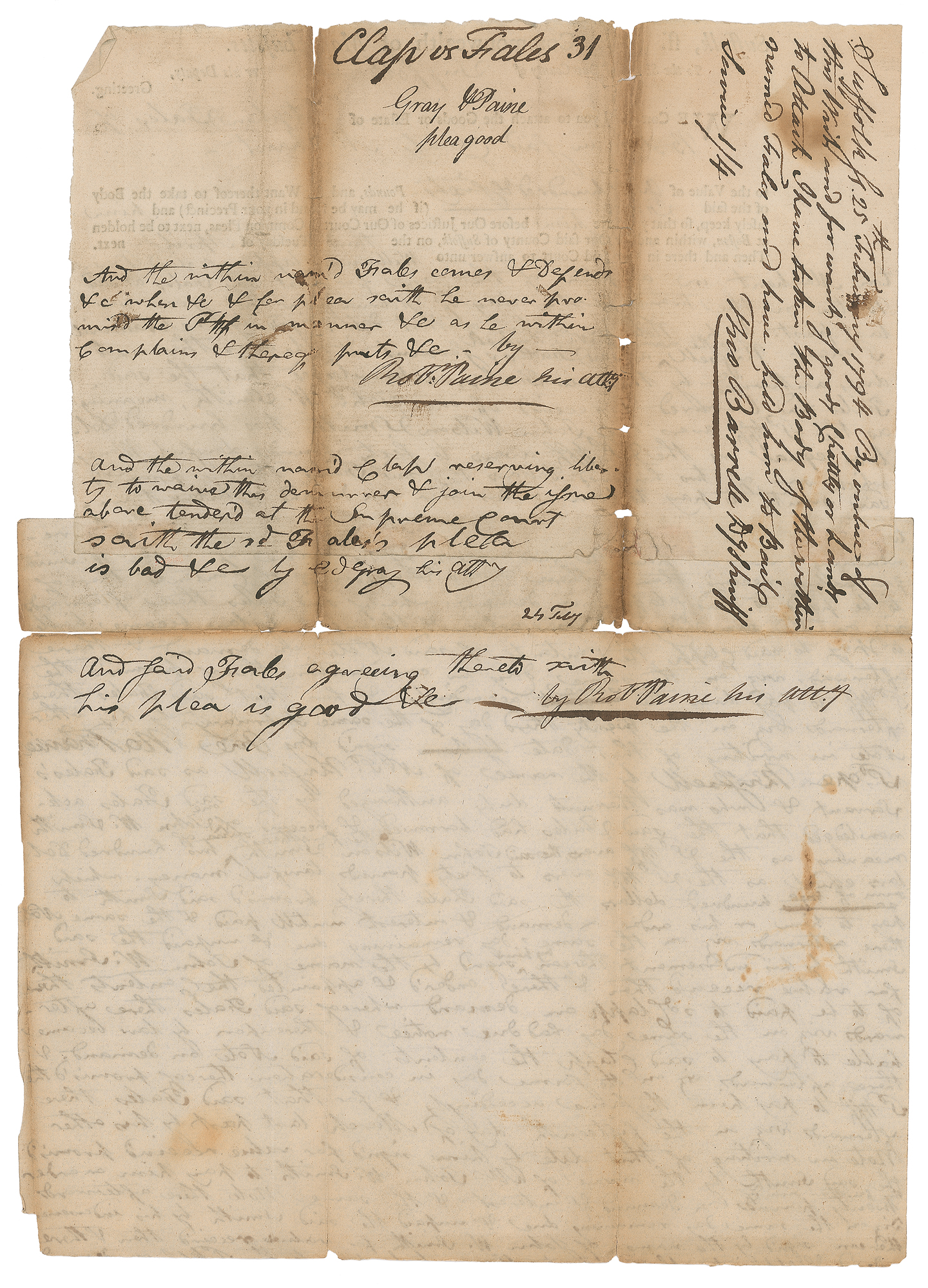 Massachusetts lawyer (1731-1814) who served as one of the prosecutors of British soldiers during the Boston Massacre trial; he later signed the Declaration of Independence. Partly-printed DS, signed twice, “Rob't Paine his att'y,” three pages two sheets, 9 x 12.5, February 24, 1794. Document commanding the sheriff of Suffolk County to bring Stephen Fales of Boston before the court to respond to a complaint made by William Clapp, endorsed twice on the reverse by Paine as Fales's defense attorney. In very good condition, with some paper loss, and toning and splitting along the fragile intersecting folds.