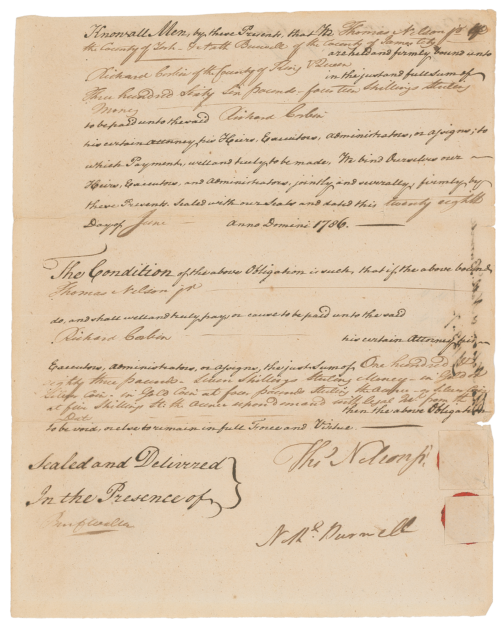 Signer of the Declaration of Independence and member of the Virginia Delegation to the Continental Congress (1738-1789). Rare manuscript DS, signed “Thos. Nelson Jr.,” one page, 7.5 x 9.25, June 28, 1786. Legal document, in part: "Know all Men, by these Presents, that Mr. Thomas Nelson, Jr,. the County of York, & Nath. Burwell?are held and firmly bound?in the just and full sum of Three hundred Sixty Six Pounds fourteen shillings sterling money." In fine condition. Accompanied by a full letter of authenticity from JSA.