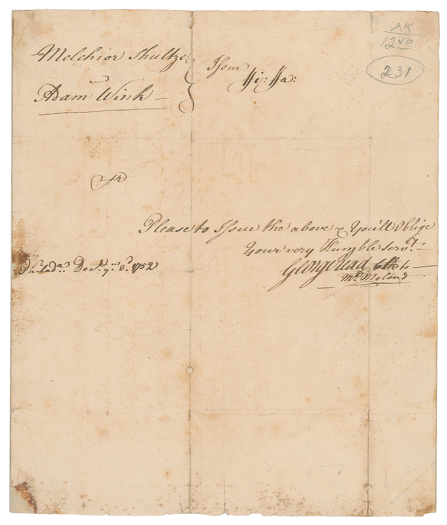Signer of the Declaration of Independence from Delaware (1733-1798). AES, one page, 6.5 x 7.75, December 3, 1752. Endorsement penned by the 19-year-old George Read on the docketing panel from a legal document concerning the case of Melchior Schultze and Adam Wink, in full: "Please to Issue the above & You'll Oblige, your very Humble Serv't, George Read, Clk to Mr. Molland." In very good to fine condition, with scattered light foxing and staining, and old repairs to back of the folds.