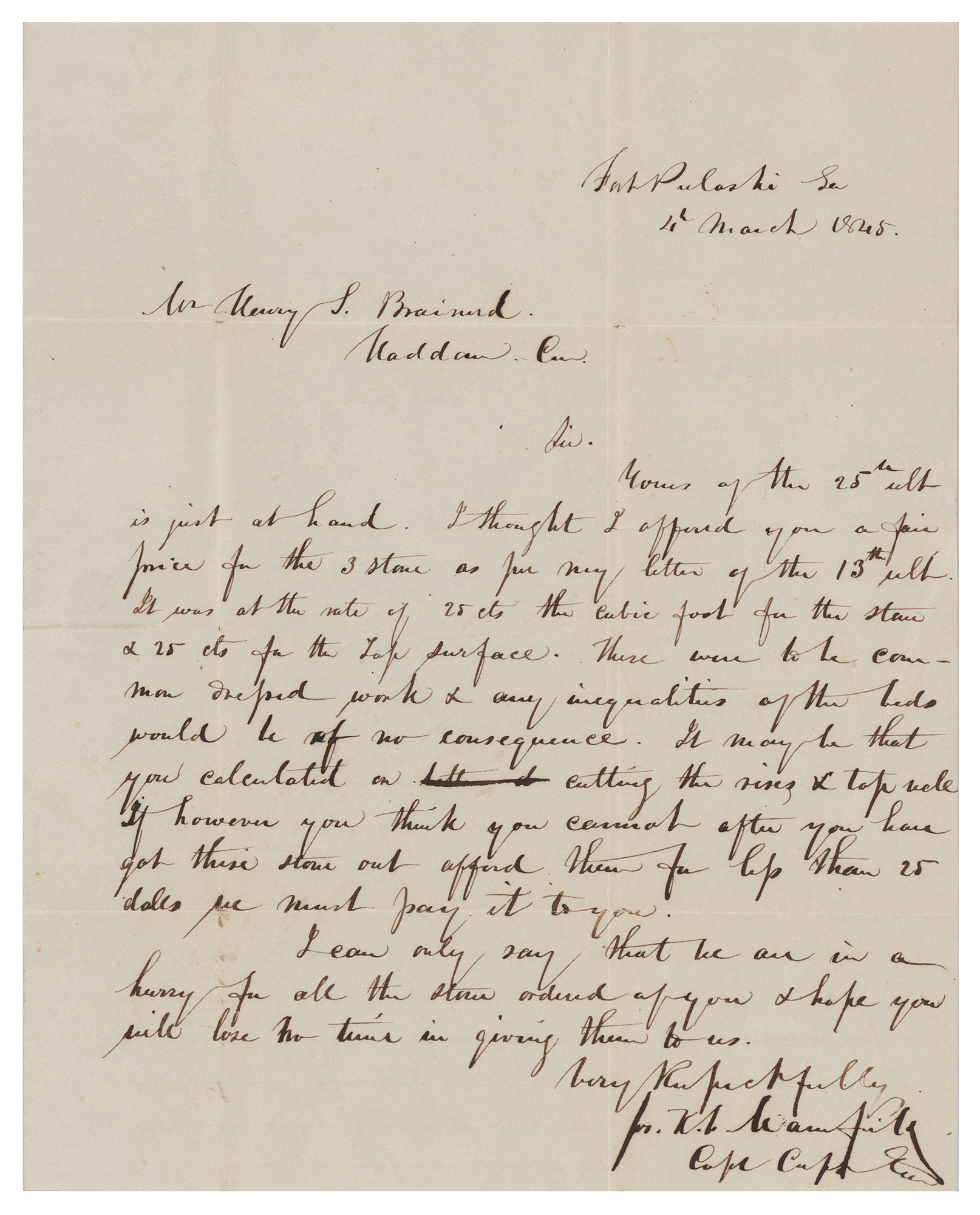 Career United States Army officer, civil engineer, and a Union general (1803-1862) who was mortally wounded at the Battle of Antietam during the Civil War. ALS signed “Jos. K. F. Mansfield,” one page, 7.75 x 9.75, April 4, 1845. Letter to Henry Brainerd, written from Fort Pulaski. In part: "I thought I offered you a fair price for the 3 stave as per my letter of the 13th…It was at the rate of 25 cts the cubic foot for the stave & 25 cts for the top surface. These were to be common dressed work & any inequalities of the beds would be of no consequence." In fine condition.