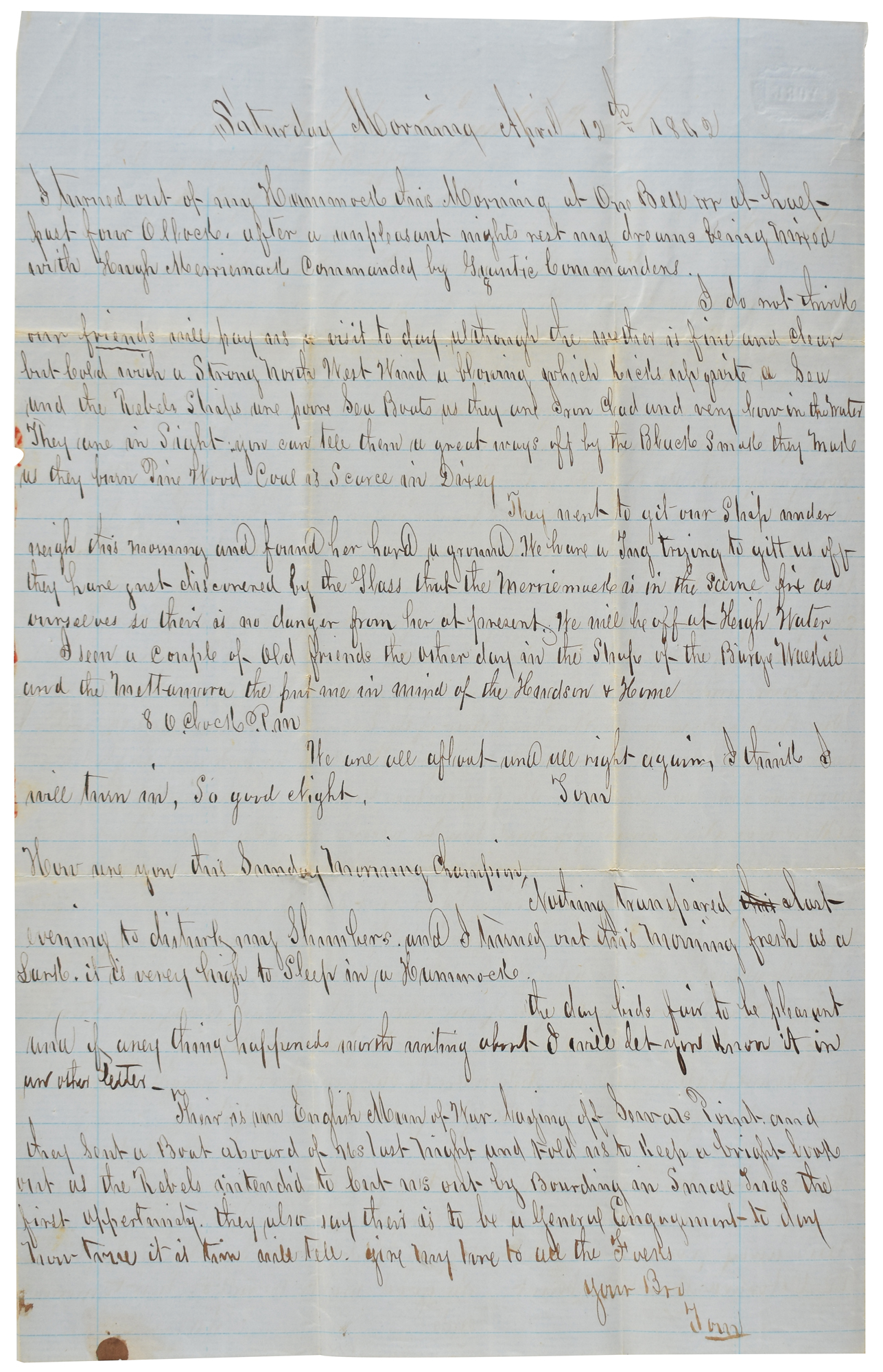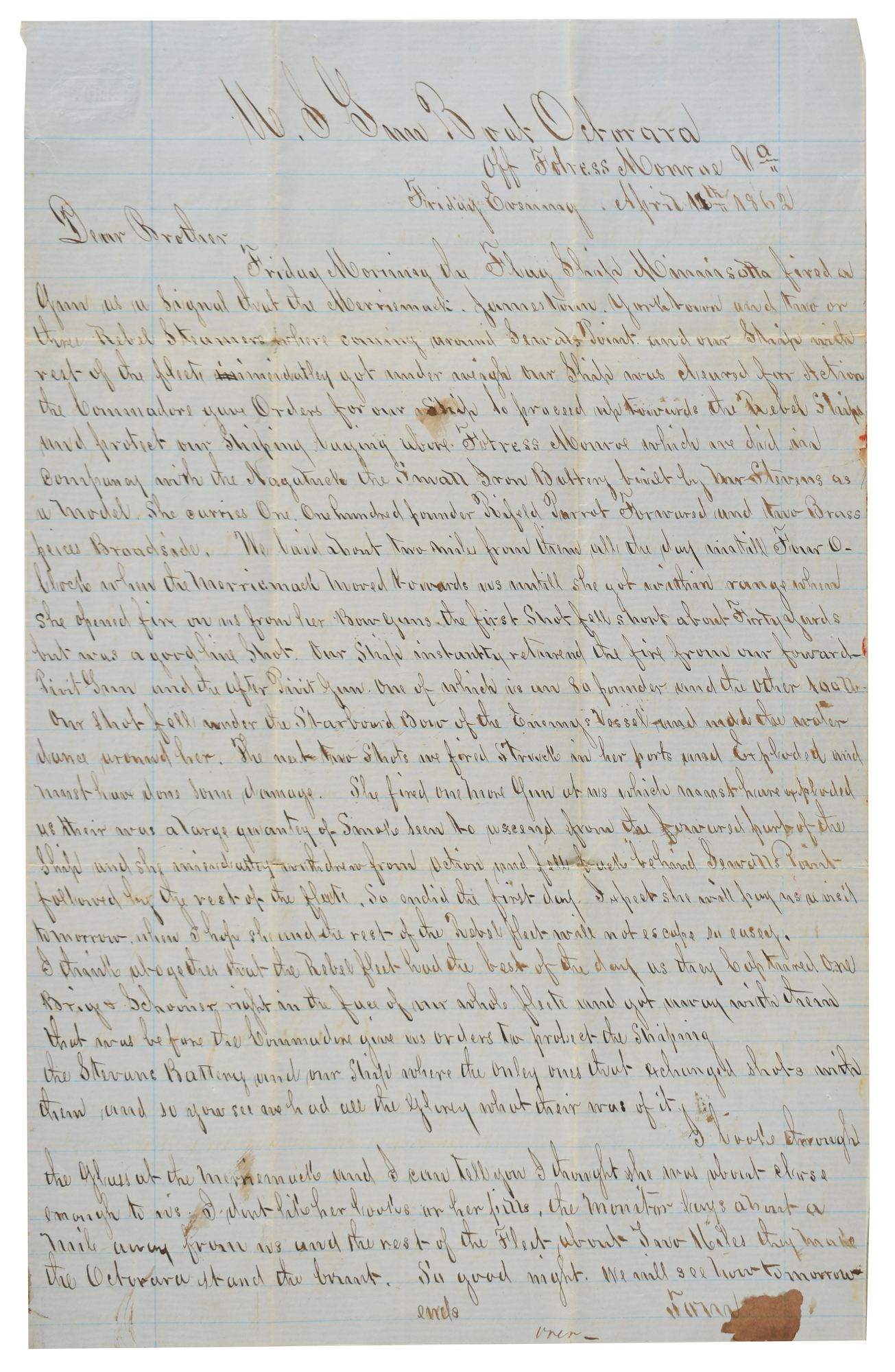 He continues on the next day, Saturday, April 12th: "I turned out of my Hammock this Morning?After an unpleasant nights rest my dreams being mixed with Huge Merrimack commanded by Gigantic Commanders. I do not think our friends will pay a visit today although the weather is fine and clear but cold with a Strong North West Wind is blowing which kicks up quite a Sea and the Rebels are poor Sea Boats as they are iron clad and very low in the water. They are in Sight—you can tell them a great ways off by the Black Smoke they made as they burn Prine Wood Coal is Scarce in Dixey. They went to git our Ship under weigh this morning and found her hard a ground. We have a tug trying to git us off. They have just discovered by Glass that the Merrimack is in the same fix as ourselves so their is no danger from her at present." On the next day, he continues: "Nothing transpired last Evening to disturb my Slumbers and I turned out this morning fresh as a Lamb?There is an English Man of War laying off Sewals Point and they send a boat aboard of us last night and told us to keep a bright look out as the Rebels intended to cut us out by boarding in small tugs the first opportunity. They also say their is to be a General Engagement to day. How true it is time will tell." In fine condition, with some toning and edge loss to the integral address leaf.
