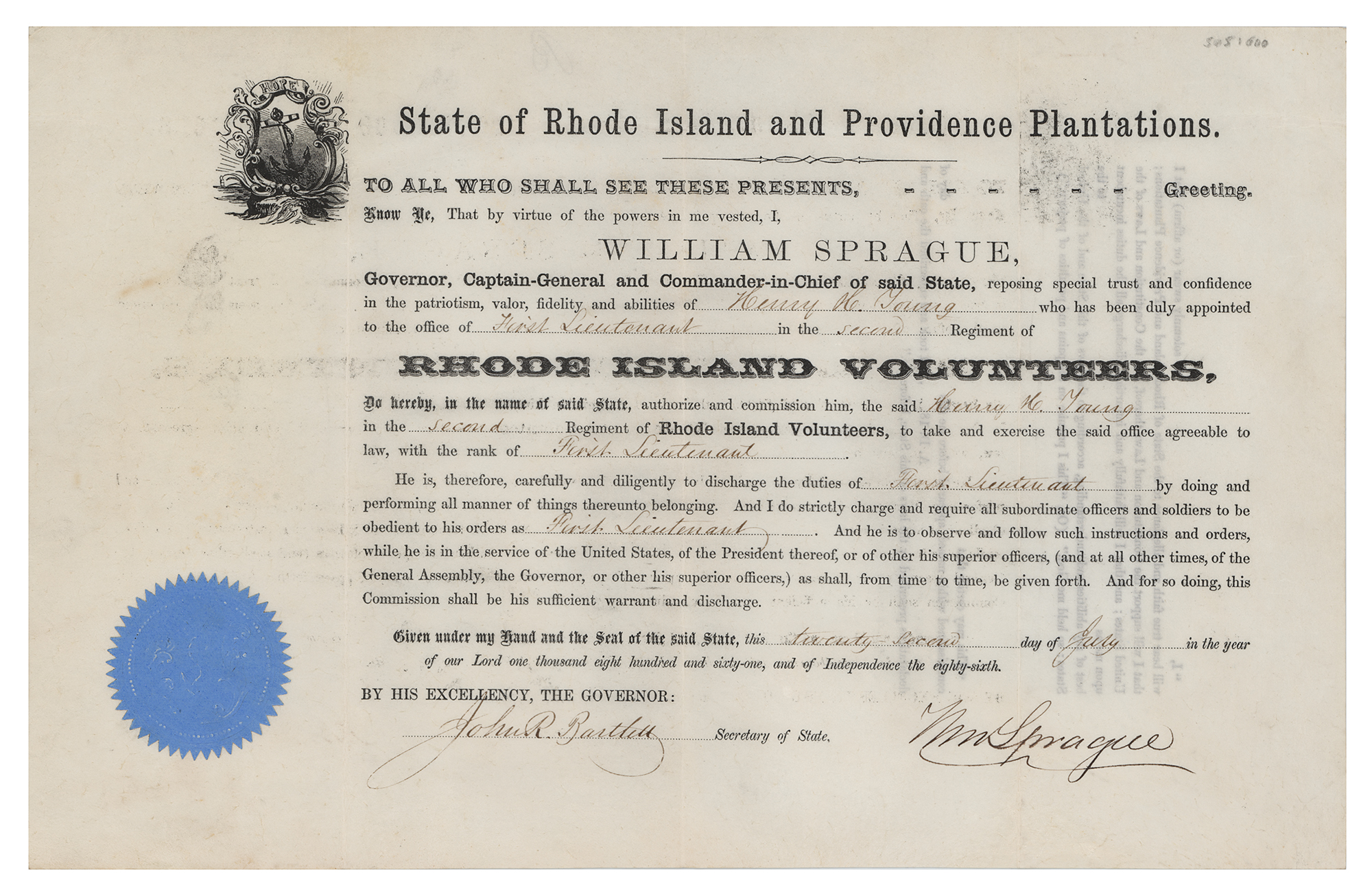 Partly-printed DS, signed “Wm. Sprague,” one page, 14 x 8.75, July 22, 1861. As governor, captain-general, and commander-in-chief of Rhode Island, Sprague appoints Henry H. Young as a "First Lieutenant in the second Regiment of Rhode Island Volunteers." Signed neatly at the conclusion by Sprague, and countersigned by John Russell Bartlett as secretary of state. Bright blue original seal remains affixed to the lower left. In fine condition.