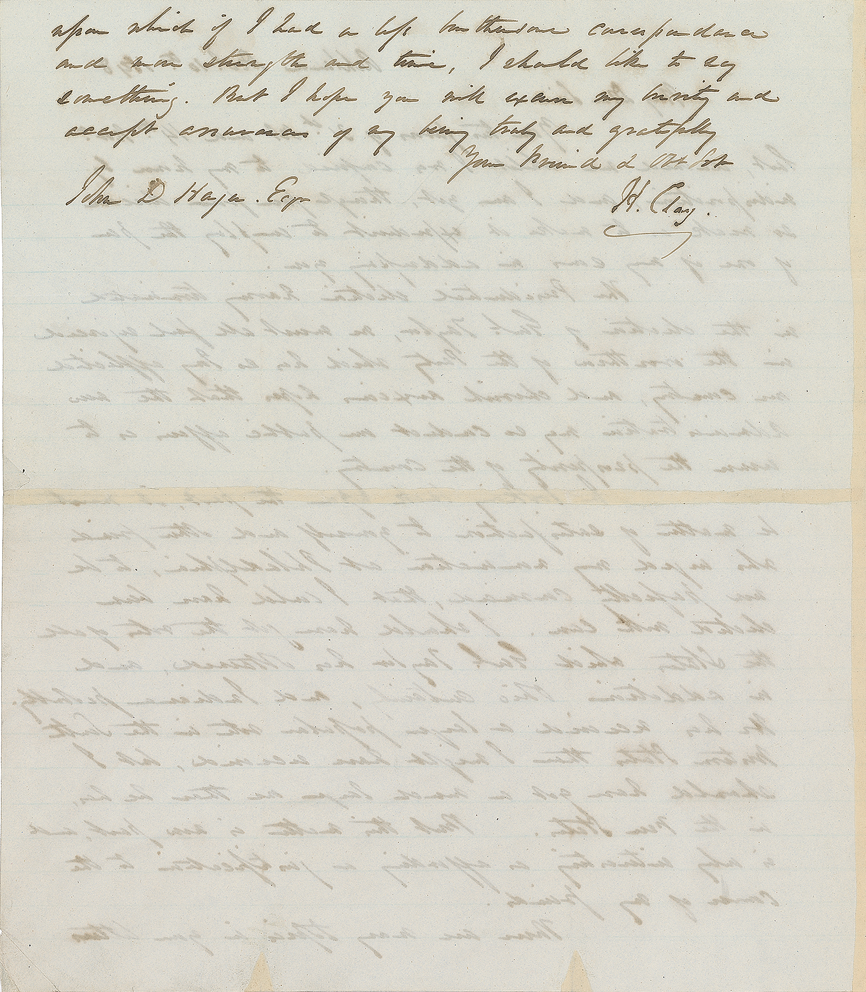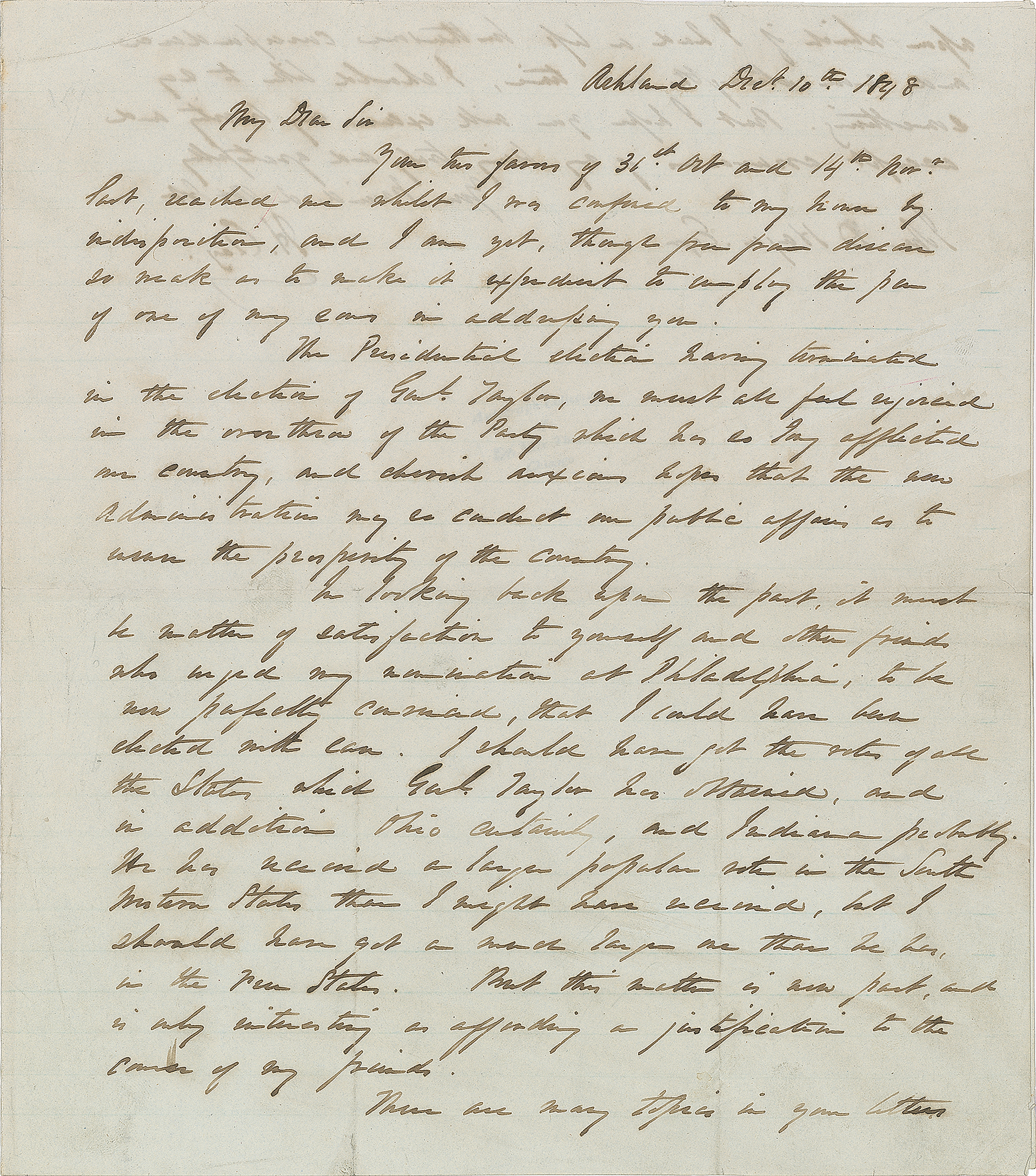 ALS signed "H. Clay," one page both sides, 9 x 10.5, December 10, 1848. Letter to friend and supporter John D. Hayes, in part: "The Presidential election having terminated in the election of Genl. Taylor, we must all feel rejoiced in the overthrow of the Party which has so long afflicted our country, and cherish anxious hopes that the new Administration may so conduct our public affairs as to assure the prosperity of the Country. In looking back upon the past, it must be a matter of satisfaction to yourself and other friends who urged my nomination at Philadelphia, to now be perfectly convinced, that I could have been elected with ease. I should have got the votes of all the States which Genl. Taylor obtained, and in addition, Ohio certainly, and Indiana probably. He has received a larger popular vote in the South Western States than I might have received, but I should have got a much larger one than he has in the new States. But this matter is now past, and is only interesting as affecting a justification to the course of my friends."