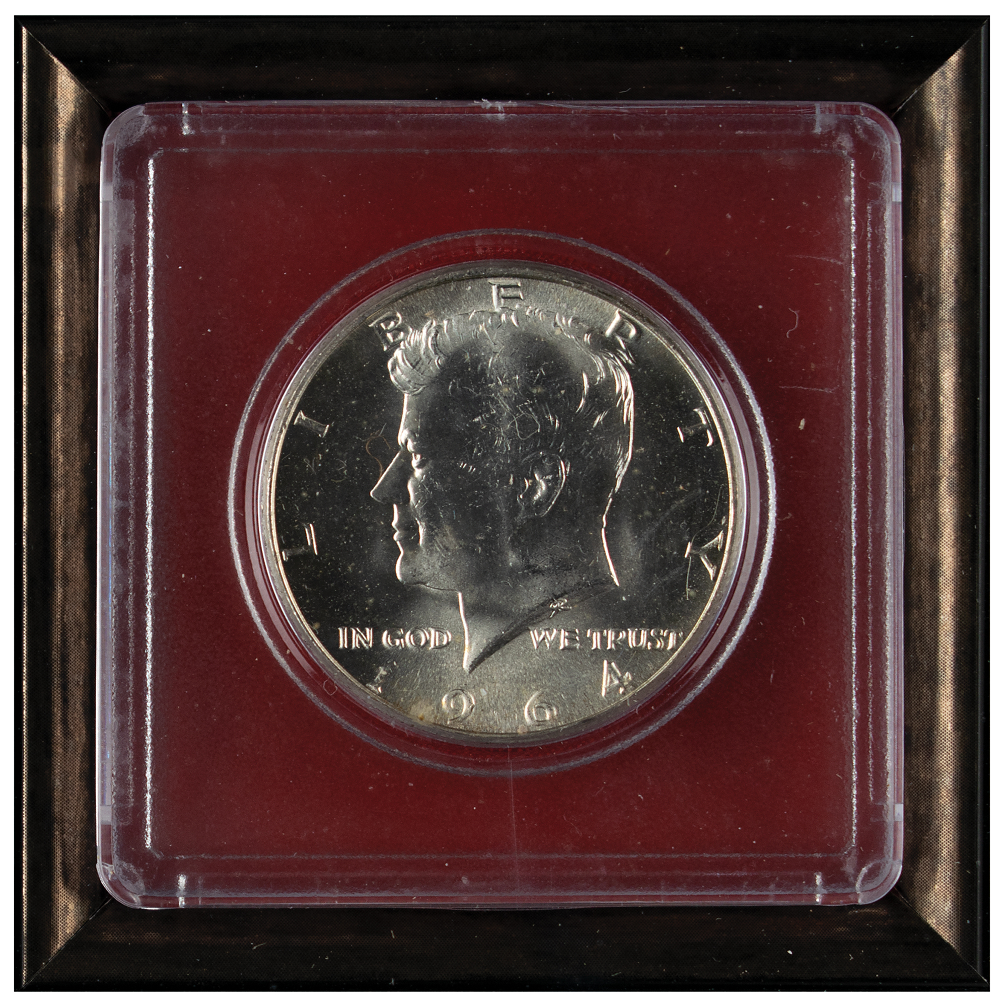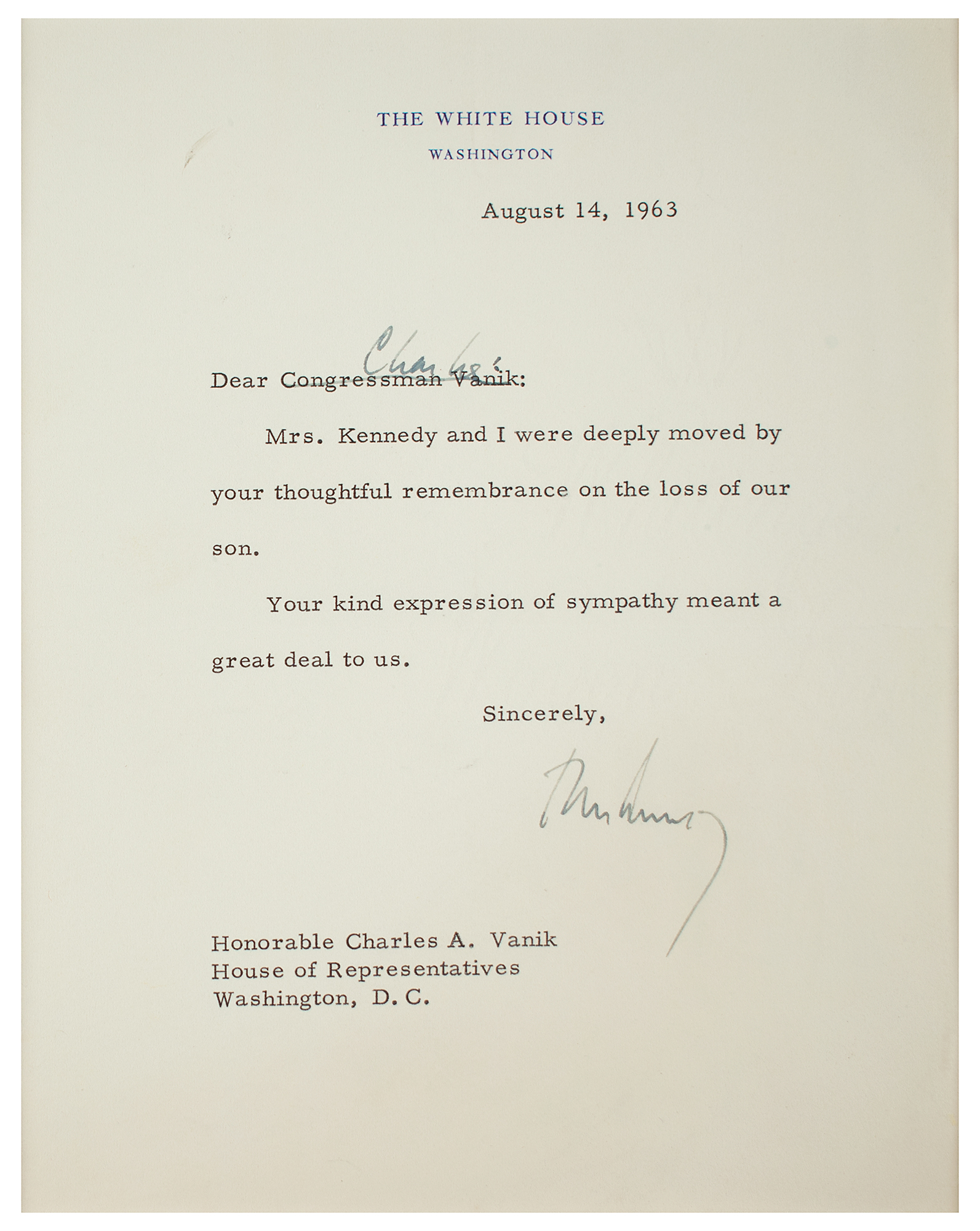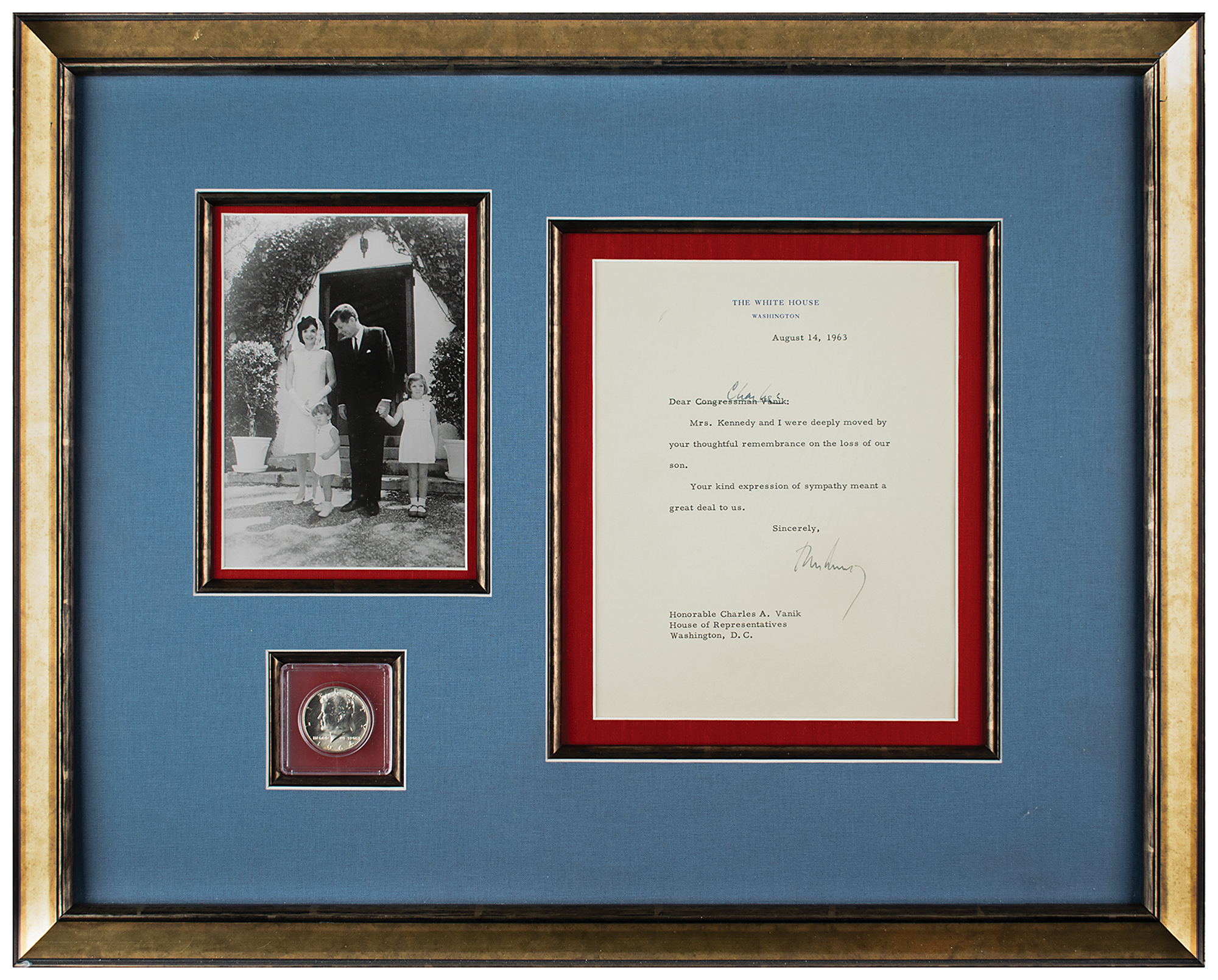 TLS as president signed “John Kennedy,” one page, 6.5 x 8.25, White House letterhead, August 14, 1963. Letter to Ohio Congressman Charles Vanik, written five days after the loss of the Kennedys' infant son, Patrick. In full: "Mrs. Kennedy and I were deeply moved by your thoughtful remembrance on the loss of our son. Your kind expression of sympathy meant a great deal to us." Kennedy amends the more formal salutation in his own hand and adds "Charles." Archivally cloth-matted and framed with a photo of the Kennedy family and a JFK half dollar coin to an overall size of 21.5 x 17.25. In fine condition. Five days prior, John and Jackie Kennedy lost their newborn son Patrick to infant respiratory distress syndrome 39 hours after his birth. Having already suffered a miscarriage in 1954, and a stillbirth the following year, Patrick's death was an especially difficult loss for the First Couple. An assassin's bullet would claim the life of President Kennedy just three months later.