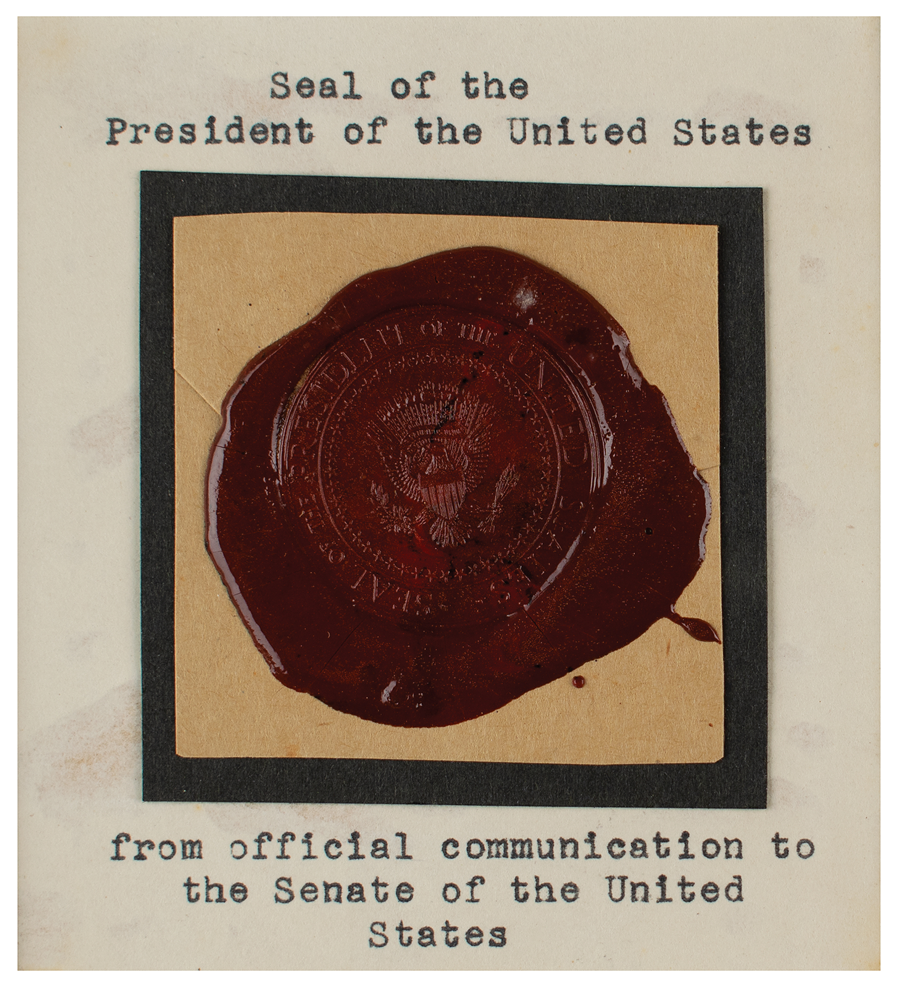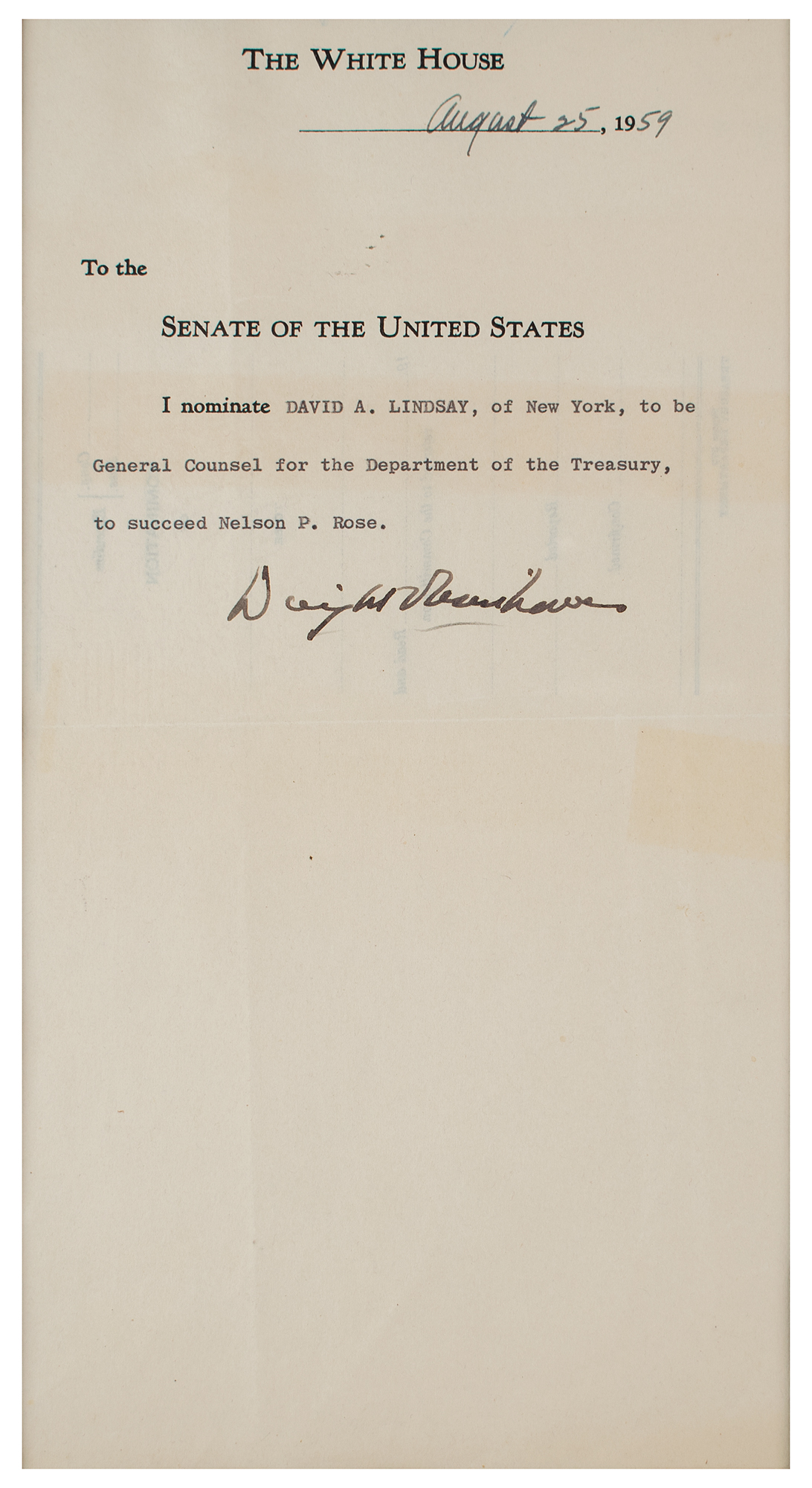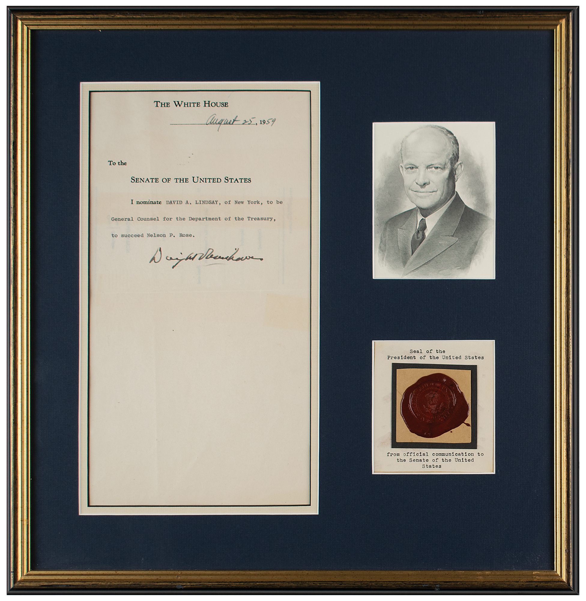 Sought-after DS as president, one page, 6.75 x 12.75, August 25, 1959. Official nomination letter from the White House, in full: "To the Senate of the United States, I nominate David A. Lindsay, of New York, to be General Counsel for the Department of the Treasury, to succeed Nelson P. Rose." Signed boldly at the conclusion by President Eisenhower. Archivally matted and framed with an engraving and the original presidential red wax seal, removed from the official communication sent to the Senate, to an overall size of 17.75 x 18.25. In fine condition, with a couple areas of faint toning. Nelson P. Rose became general counsel to the Treasury in the Eisenhower Administration, after having been chief counsel to the Internal Revenue Service from 1957 to 1959. He was awarded the department's Alexander Hamilton Medal.