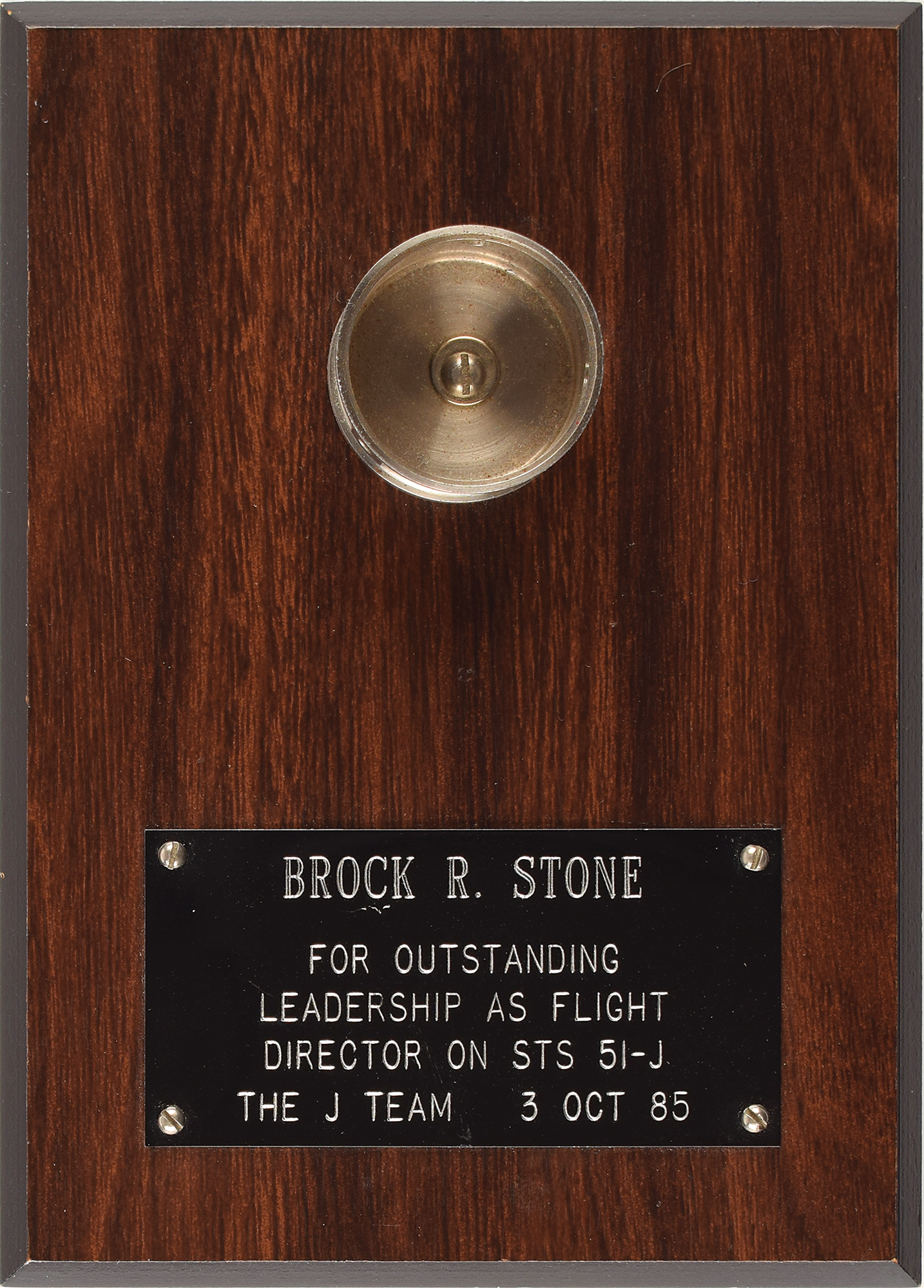 Also included is a Space Shuttle artifact mounted to a 5 x 7 wooden plaque, with engraved plate below: "Brock R. Stone, For outstanding leadership as flight director on STS 51-J, The J Team, 3 Oct 85." STS-51-J, launched on October 3, 1985, was the first flight of the Space Shuttle Atlantis, carrying a payload for the Department of Defense. Although this cargo was classified, it was reported that two Defense Satellite Communications System satellites were deployed in stationary orbits during the four-day mission.