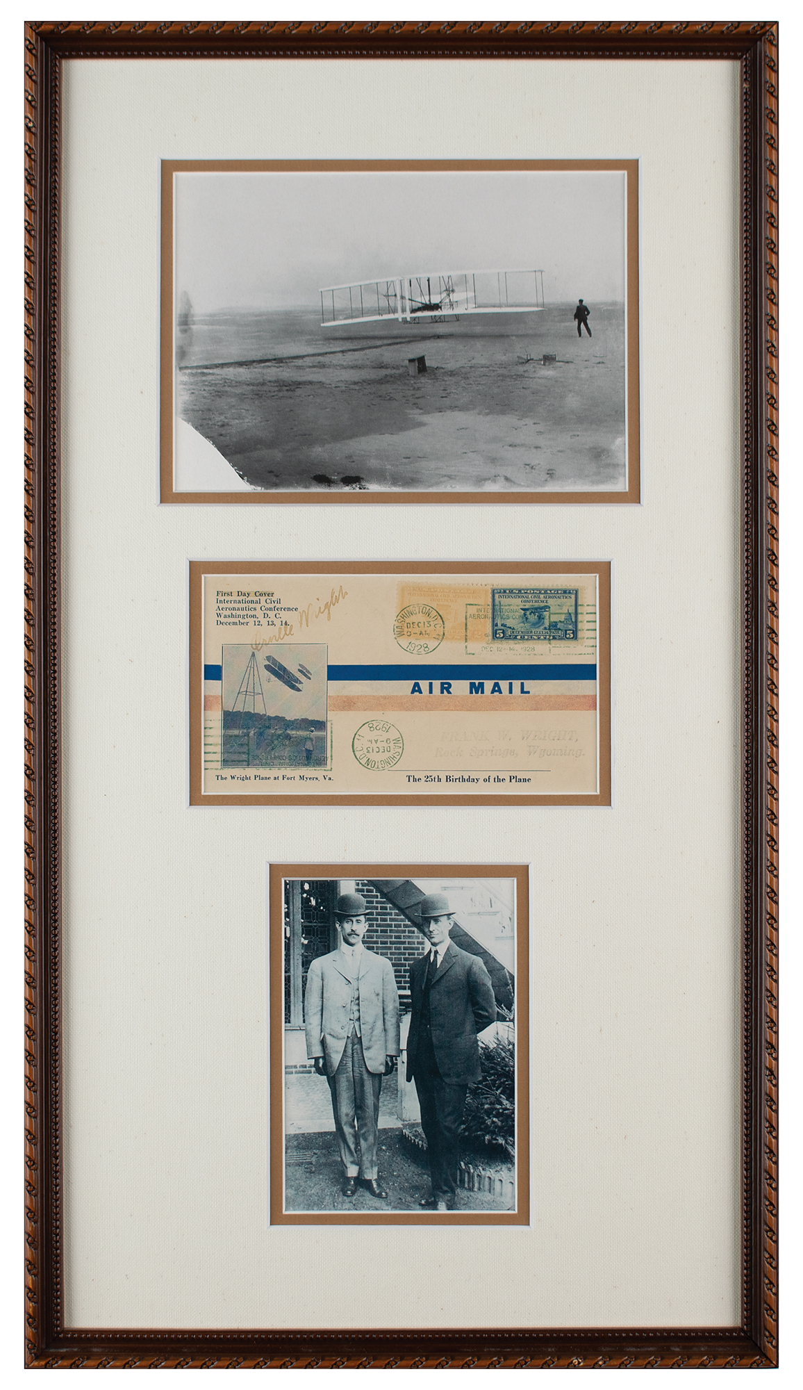 Scarce ‘Air Mail’ FDC issued at the International Civil Aeronautics Conference of 1928 in honor of the 25th anniversary of the Wright brothers' first powered flight, signed nicely in fountain pen by Orville Wright. The cover is postmarked at Washington, D.C., on December 13, 1928, and features an image cachet of Orville Wright demonstrating the flyer to the U.S. Army in Fort Myer, Virginia, in September 1908. The cover bears an address stamp to lower right: “Frank W. Wright. Rock Springs, Wyoming.” Cloth-matted and framed with two photos to an overall size of 12.25 x 21.75. In fine condition, with the signature a couple of shades light.