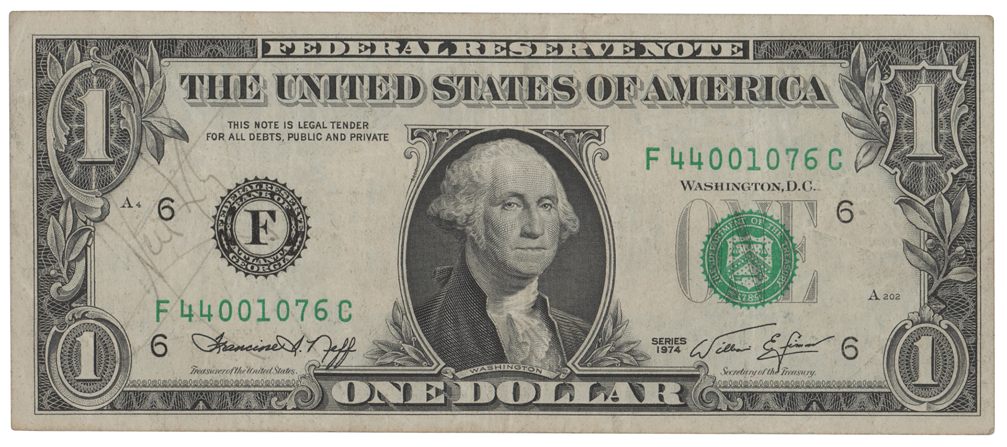 Series 1974 one-dollar bill, signed on the left side in black ballpoint by Apollo 11 moonwalker Neil Armstrong. In fine condition, with the signature very faded, but completely legible.