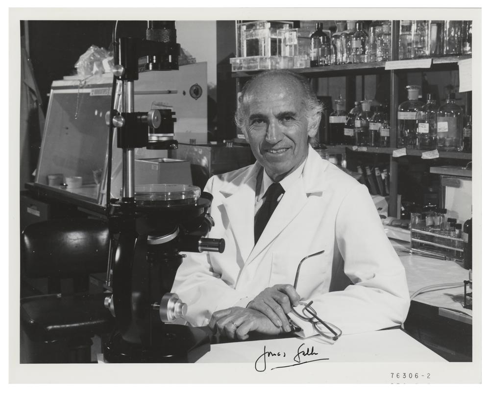 Glossy 10 x 8 photo of Jonas Salk in his lab, signed in black felt tip. In fine condition.