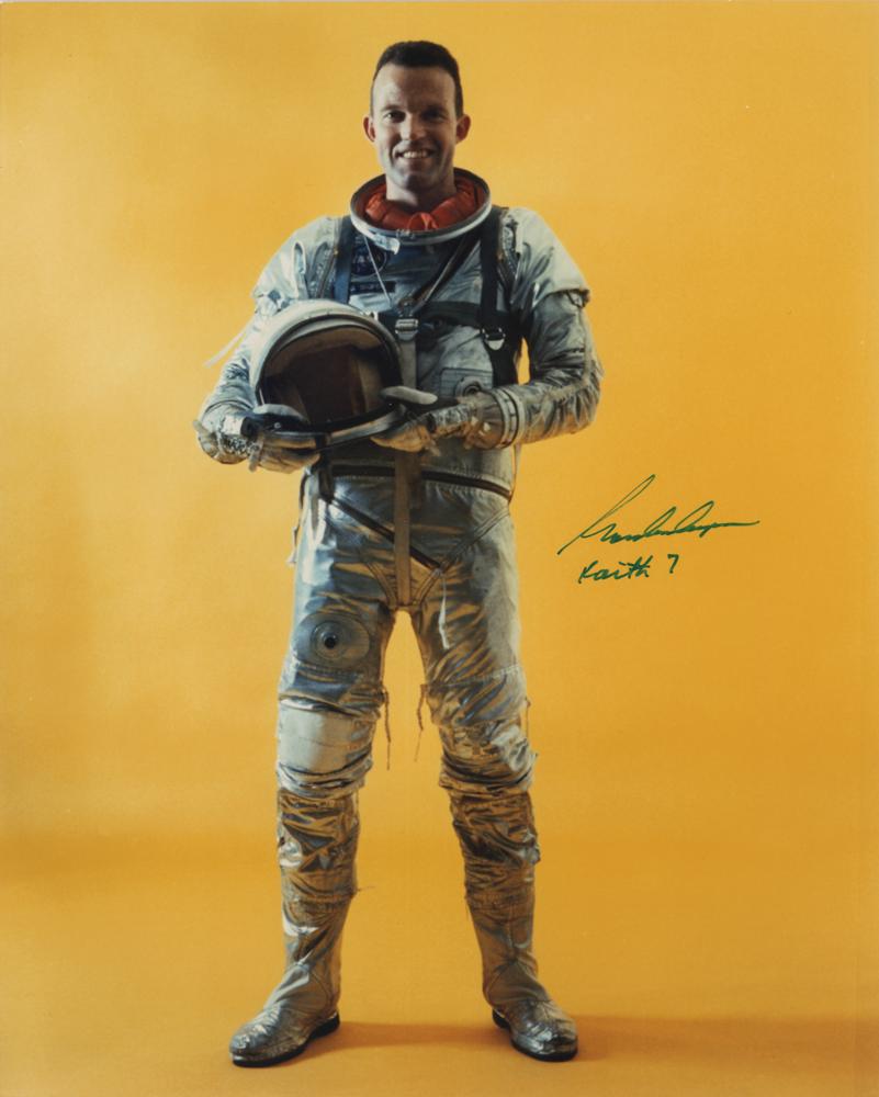 Color satin-finish 8 x 10 full-length photo of Cooper, with helmet in hand, posing in his Mercury space suit against a yellow background, signed in thin black felt tip, "Gordon Cooper, Faith 7." In fine condition, with a light bend to the left background area.
