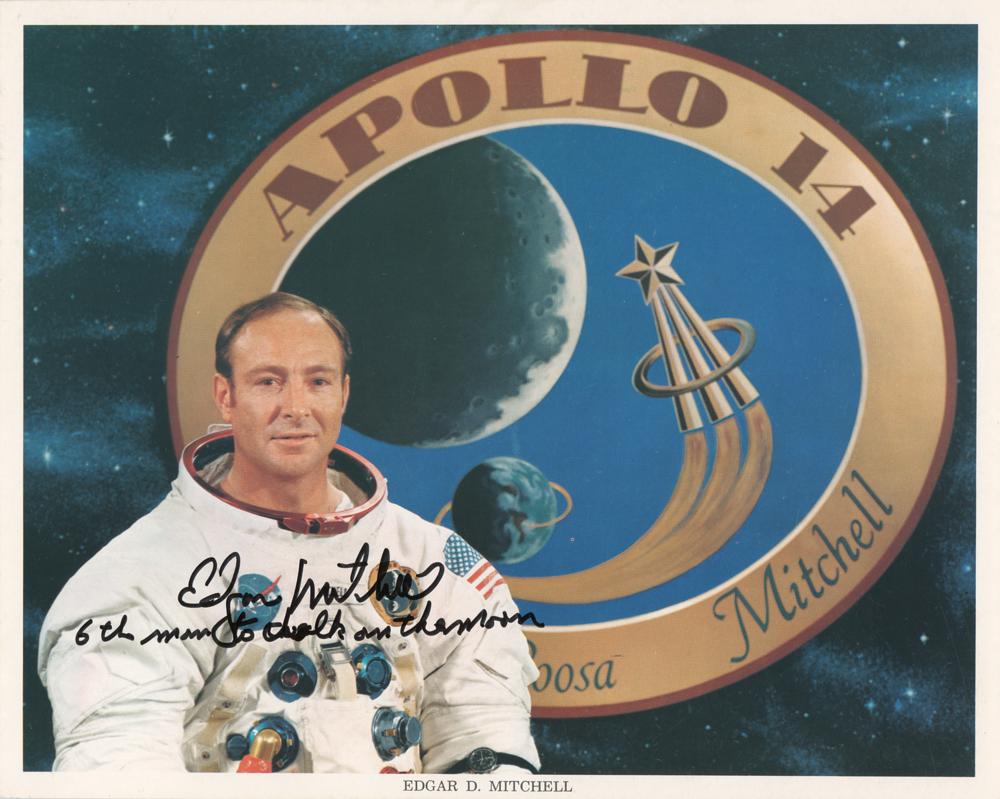Official color 10 x 8 NASA lithograph of Mitchell posing in his white space suit against the Apollo 14 mission insignia, signed in black felt tip, "Edgar Mitchell, 6th man to walk on the moon, Apollo 14." In fine condition, with a light bend to the upper background area.