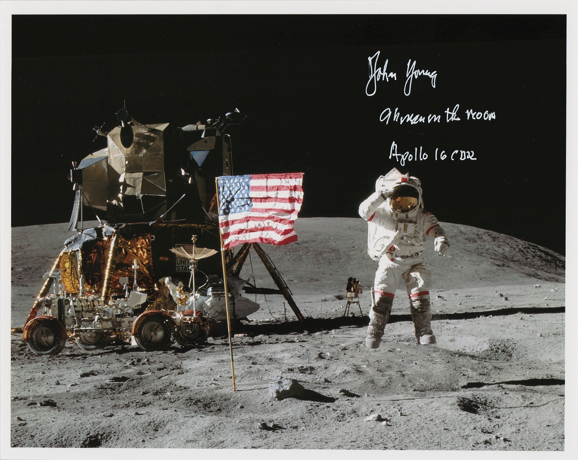 Color satin-finish 10 x 8 photo of Young leaping off the lunar surface and saluting the American flag, signed in white ink, "John Young, 9th Man on the Moon, Apollo 16 CDR." In very fine condition.