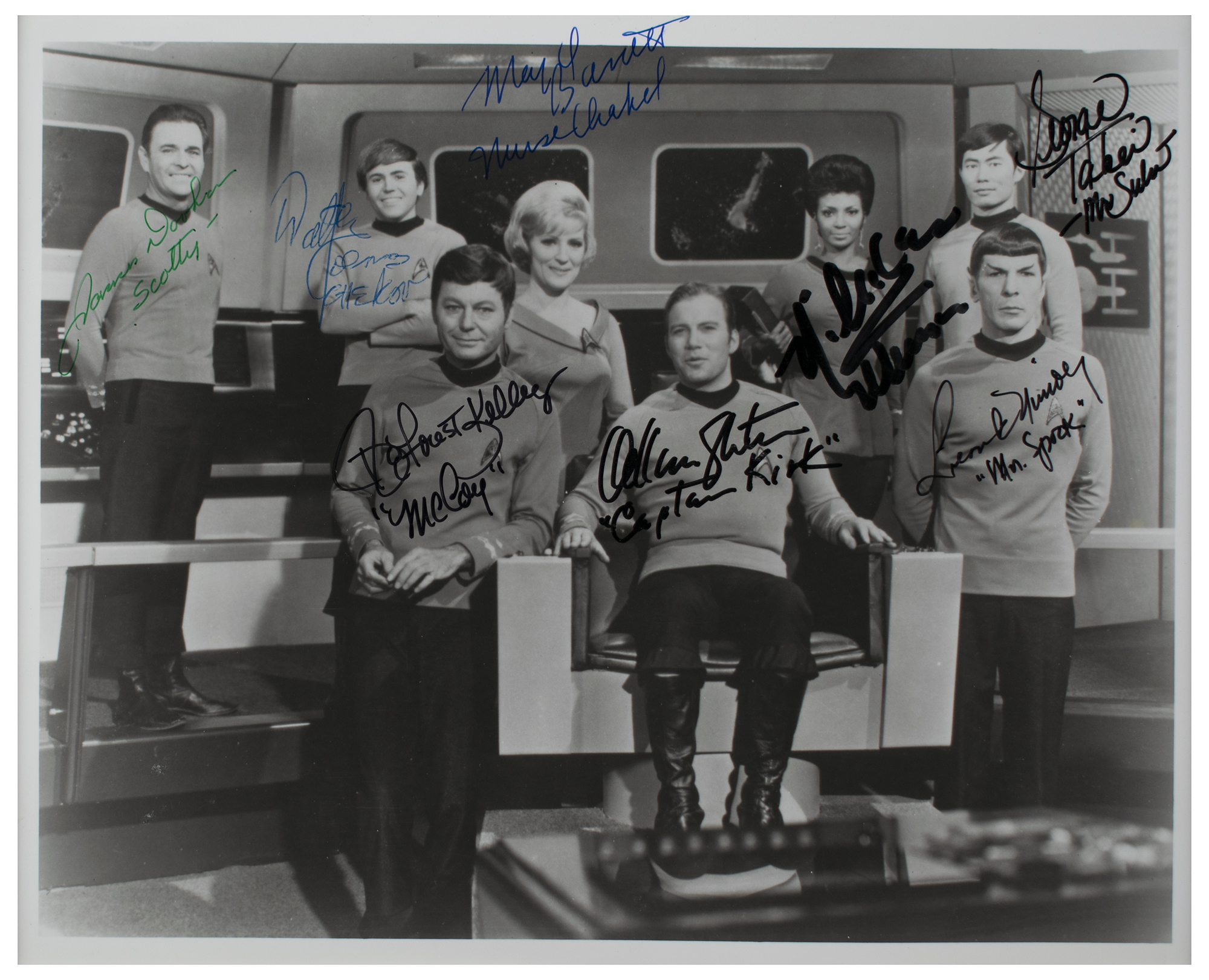 Appealing glossy 9.75 x 7.75 photo of the cast of the original Star Trek television series, signed by all pictured in black felt tip, "William Shatner, 'Captain Kirk,'" "Leonard Nimoy, 'Mr. Spock,'" "DeForest Kelley, 'McCoy,'" "Nichelle Nichols," and "George Takei, -Mr. Sulu-," in blue ink and ballpoint, "Walter Koenig, Chekov" and "Majel Barrett, Nurse Chapel," and in green ink, "James Doohan, Scotty." Double-matted to an overall size of 15 x 13. In fine condition.