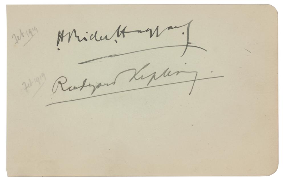 Fountain pen signatures on Rudyard Kipling and H. Rider Haggard on an off-white 6 x 3.75 album page, with pencil notations dating them both to February 1919. Reverse bears a Tyler Kipling Collection seal. In fine condition.