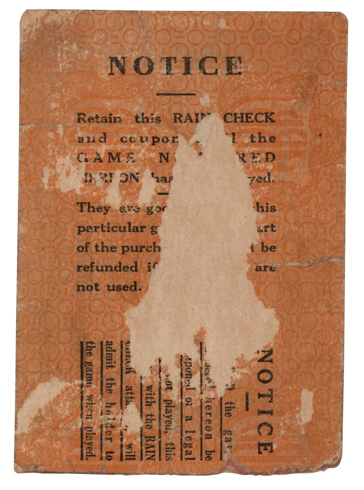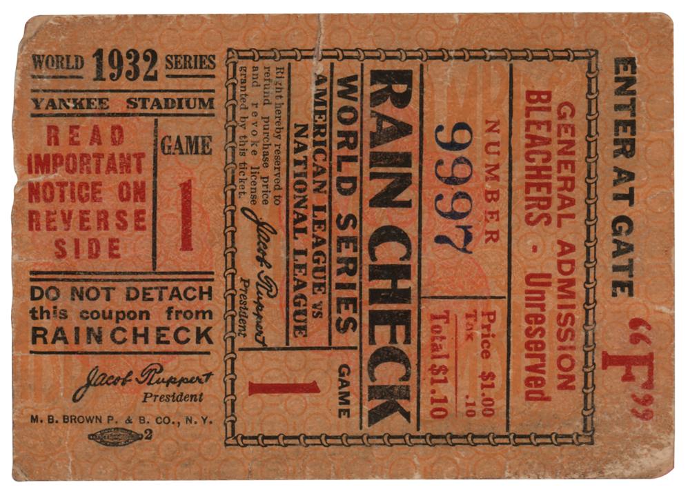 Ticket stub for a general admission bleacher seat at Game 1 of the 1932 World Series at Yankee Stadium, between the New York Yankees and Chicago Cubs. Babe Ruth and Lou Gehrig each scored three times in the Yankees' 12-6 victory, with starting pitcher Red Ruffing notching the complete-game win. The Yankees would go on to win in a four-game sweep, punctuated by Babe Ruth's famous 'called shot' in Game 3 at Wrigley Field. In good to very good condition, with scattered wear, creasing, and paper loss to reverse.