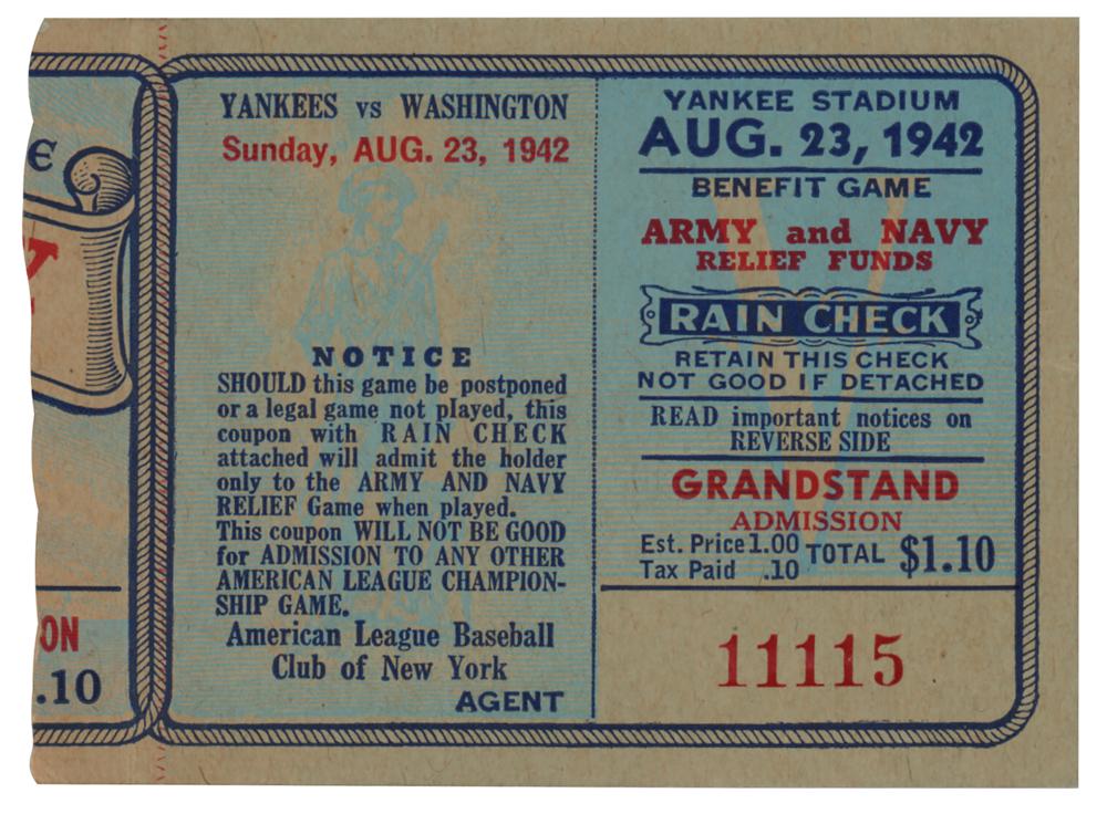 Ticket stub for a grandstand seat at the military benefit exhibition between the New York Yankees and Washington Senators at Yankee Stadium on August 23, 1942, which raised $80,000 for the Army and Navy Relief Funds during World War II. The game is remembered for a matchup between Walter Johnson and Babe Ruth: the 54-year-old hurler threw 17 pitches to the 47-year-old slugger, who slammed the final pitch over the right field fence (just foul). Playing to the crowd, Ruth circled the bases anyway and left the field to a rousing ovation. In fine condition.