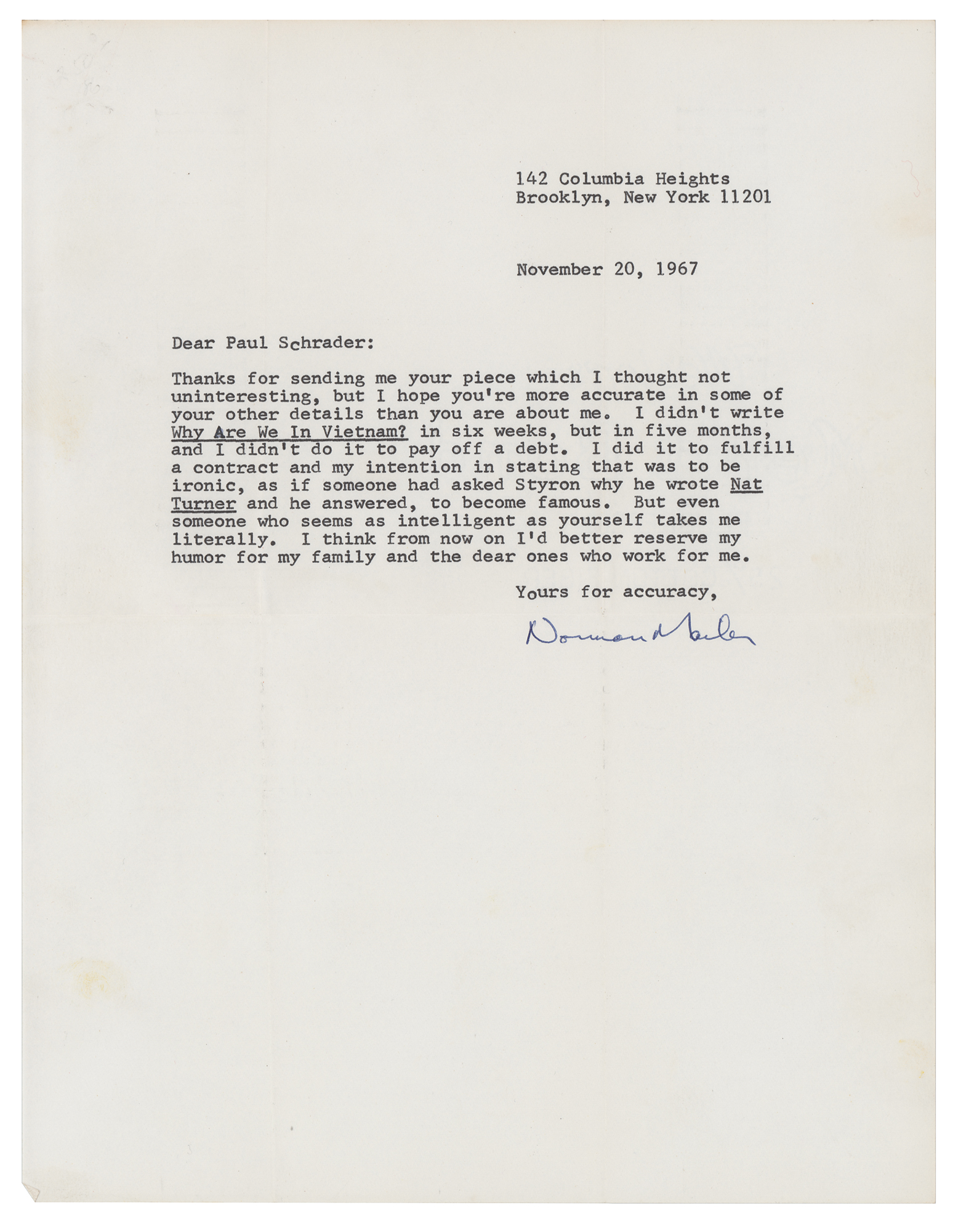TLS, one page, 8.5 x 11, November 20, 1967. Letter to Paul Schrader, associated editor of The Calvin College Chimes (and future screenwriter of Taxi Driver and Raging Bull). In full: "Thanks for sending me your piece which I thought not uninteresting, but I hope you're more accurate in some of your other details than you are about me. I didn't write 'Why Are We In Vietnam?' in six weeks, but in five months, and I didn't do it to pay off a debt. I did it to fulfill a contract and my intention in stating that was to be ironic, as if someone had asked Styron why he wrote Nat Turner, and he answered, to become famous. But even someone who seems as intelligent as yourself takes me literally. I think from now on I'd better reserve my humor for my family and the dear ones who work for me." In fine condition. Accompanied by the original mailing envelope.