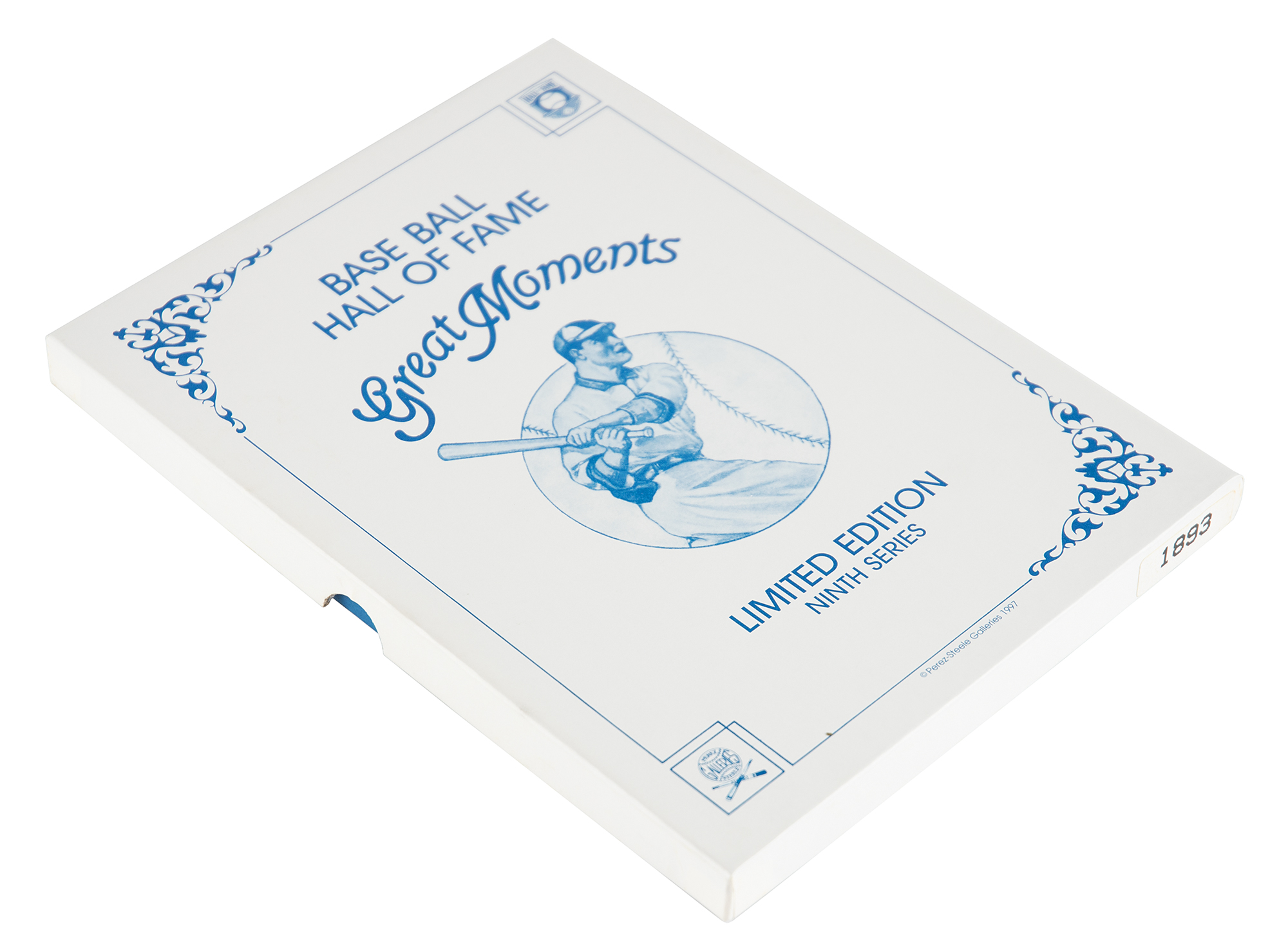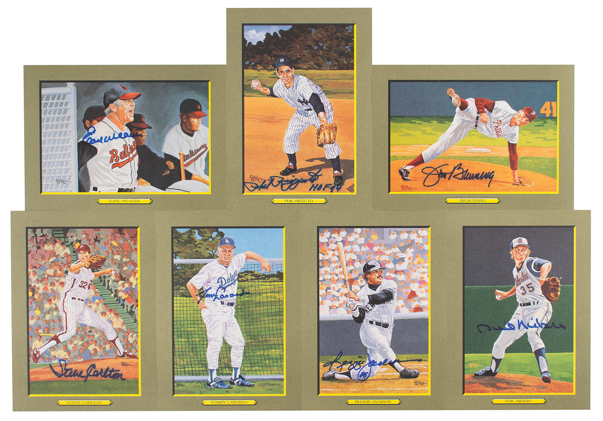Limited edition group of Perez-Steele Baseball Hall of Fame 'Great Moments' (Series 9) oversized art cards, numbered 1,893/10,000, with seven signed in blue felt tip. Signers are: Jim Bunning, Steve Carlton, Tommy Lasorda, Reggie Jackson, Phil Niekro, Phil Rizzuto, and Earl Weaver. In overall fine condition. Accompanied by the original box and five unsigned cards.