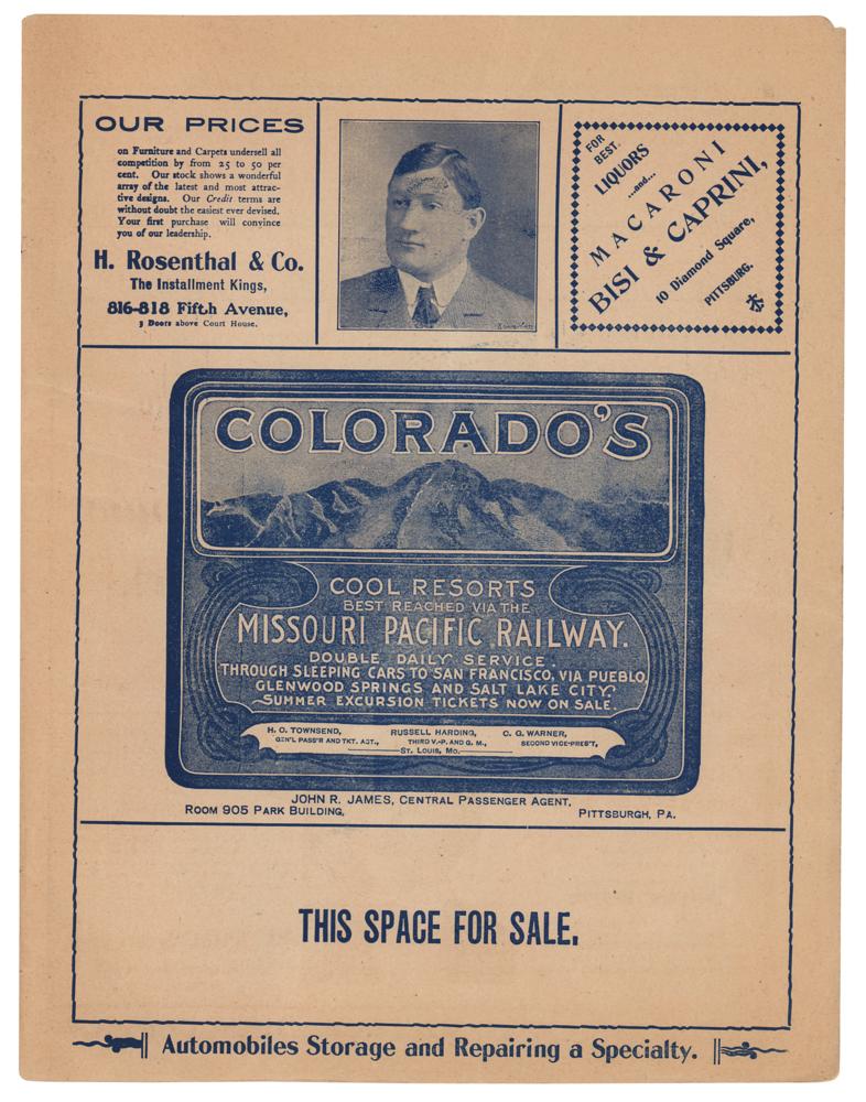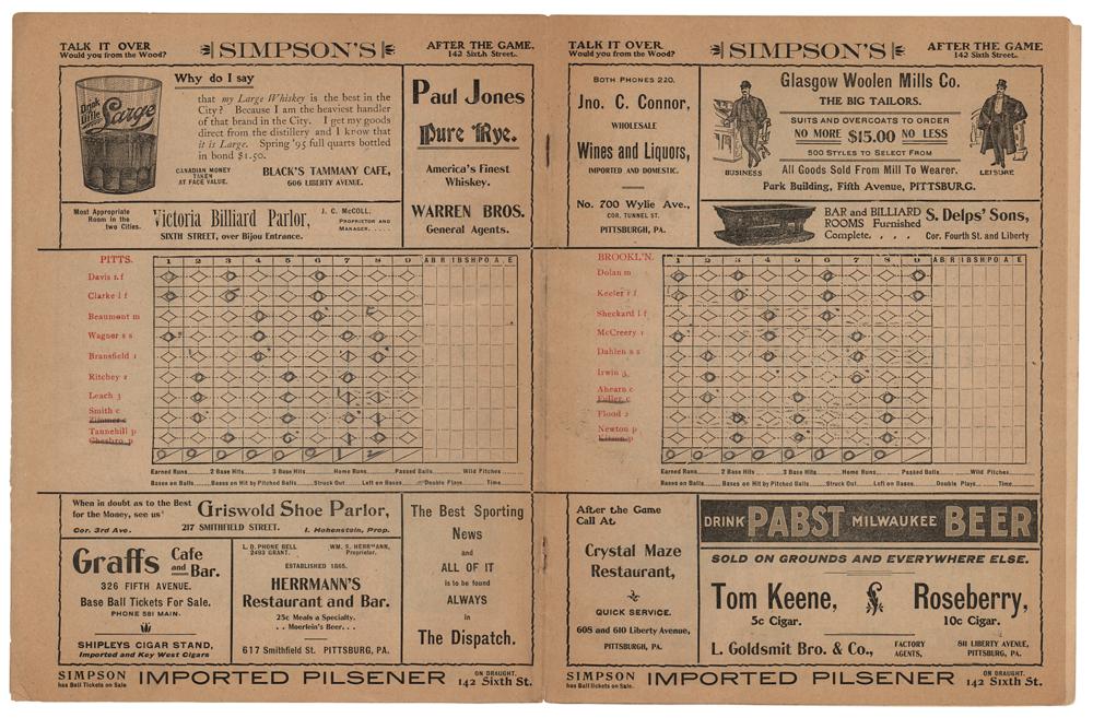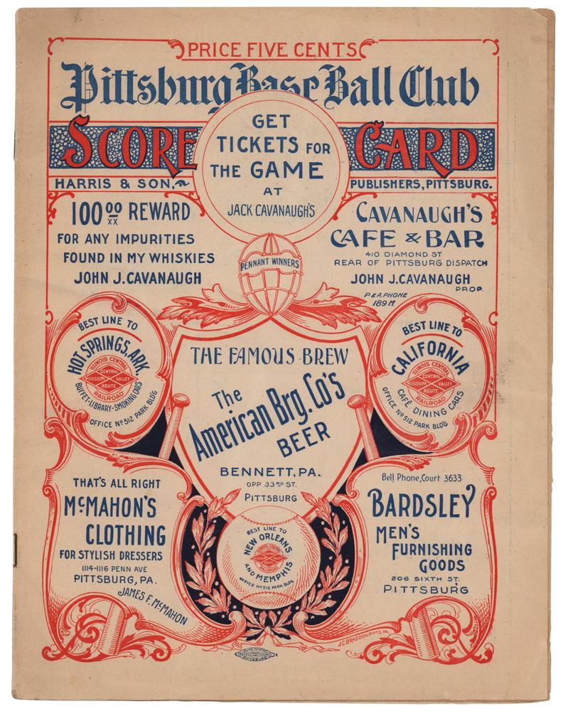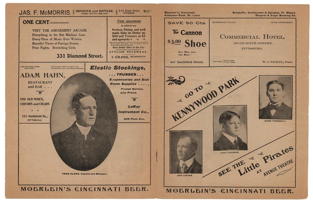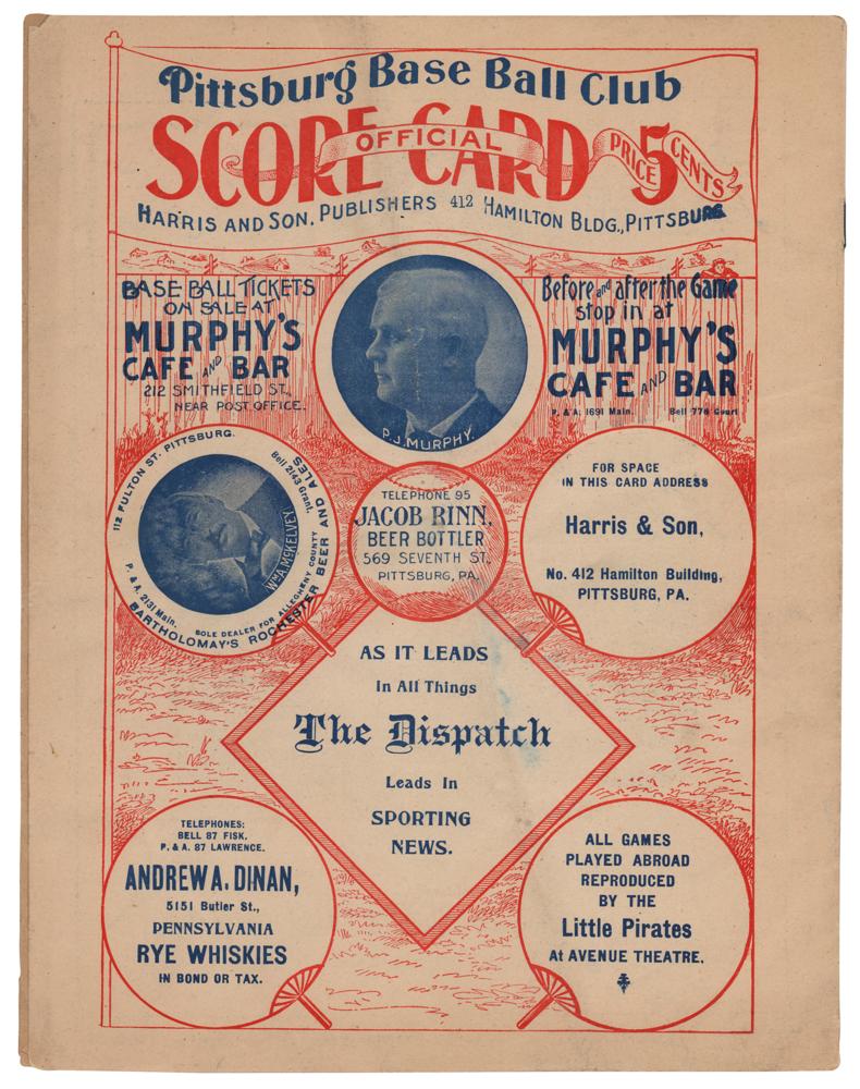 Original "Pittsburg Base Ball Club" program and scorecard for the game against the Brooklyn Superbas on July 4, 1902, 16 pages, 7.75 x 10, featuring several images of key Pirates throughout, including Hall of Famers Fred Clarke, Jack Chesbro, and Honus Wagner. The centerfold scorecard has been filled out in pencil. In very good condition, with light handling wear and some creasing to corners.