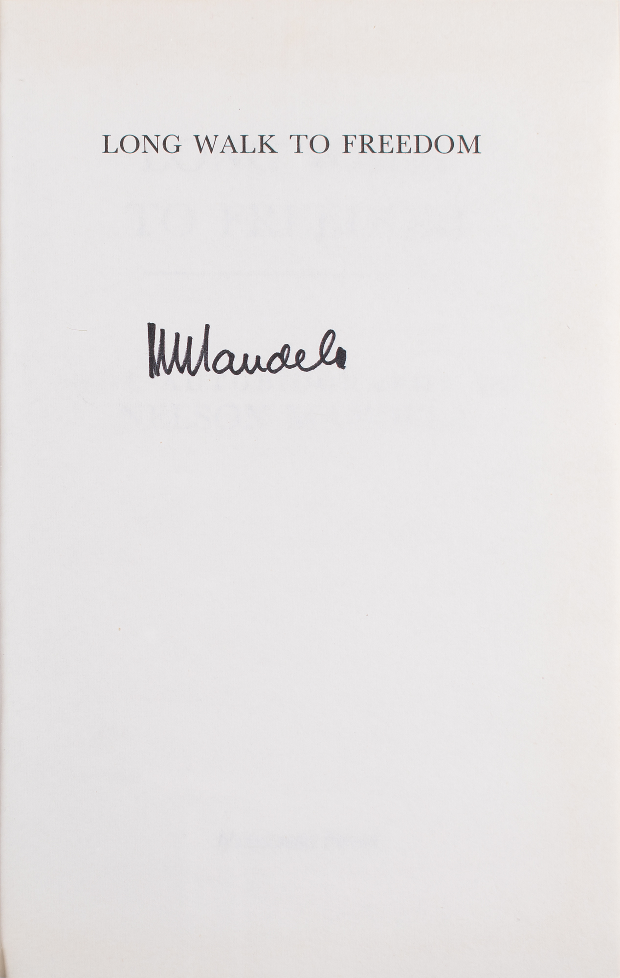 Signed book: Long Walk to Freedom. Randburg, South Africa: Macdonald Purnell, 1994. Hardcover with dust jacket, 6.5 x 9.5, 630 pages. Signed on the half-title page in black felt tip, "N. Mandela." In fine condition, with light dust jacket wear.