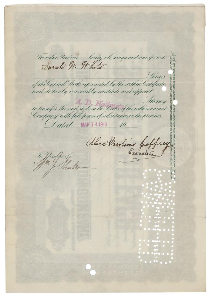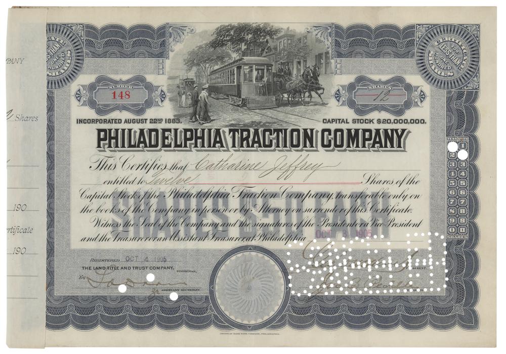 American businessman (1861-1912) who died in the sinking of the RMS Titanic. After the ship struck an iceberg, Widener placed his wife and her maid in a lifeboat. The women were rescued by the steamship RMS Carpathia, but Widener and his son Harry perished on the Titanic. Partly-printed DS, signed “Geo. D. Widener,” one page, 11.75 x 8.25, October 4, 1905. Stock certificate for 12 shares in the Philadelphia Traction Company, signed at the conclusion by Widener as the company's president. In fine condition, with cancellation holes affecting the signature.