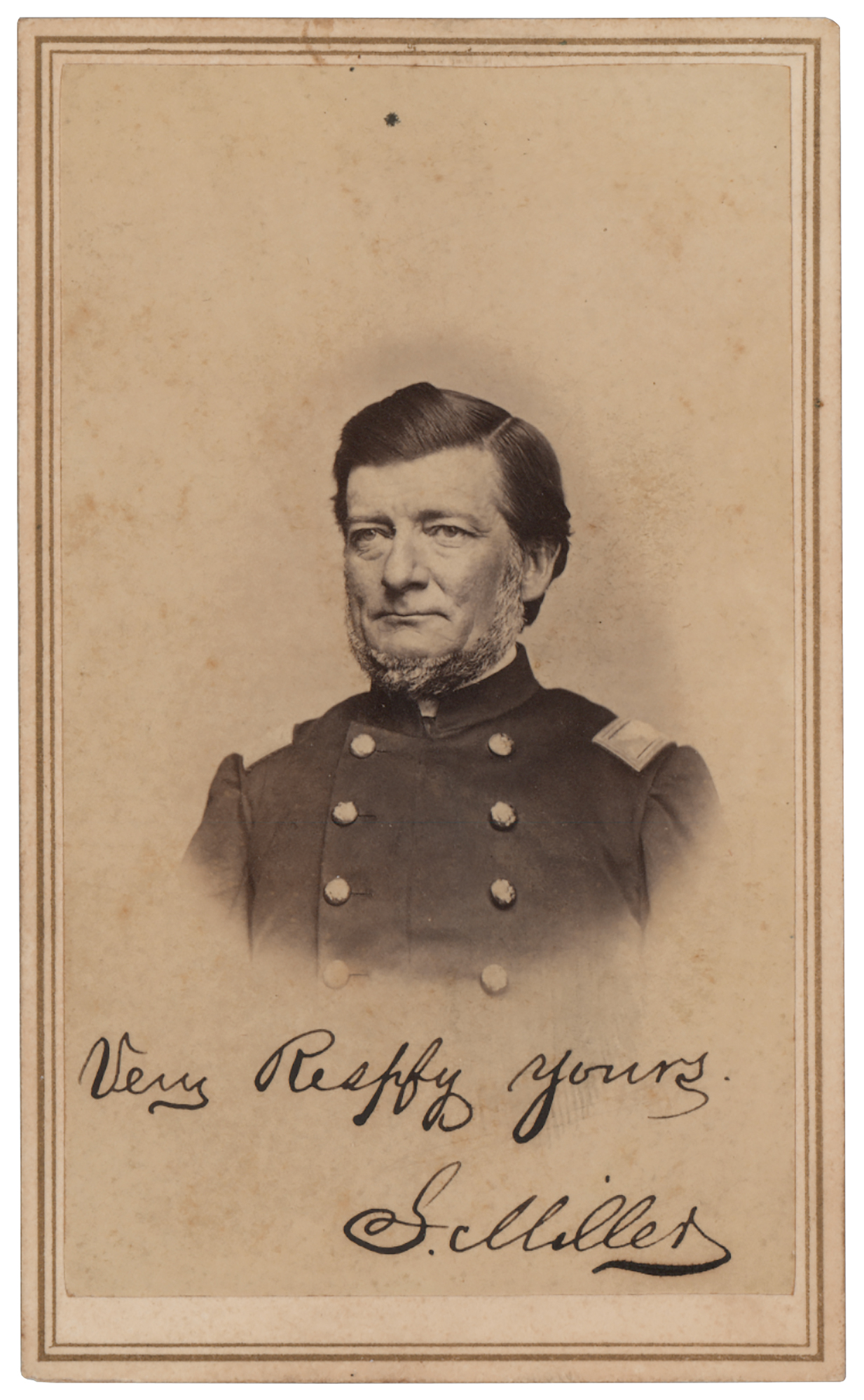 Republican politician (1816-1881) who was the first Civil War veteran to serve as governor of Minnesota; in his final address to the legislature, he strongly but unsuccessfully urged adoption of a black suffrage amendment to the state constitution. Uncommon 2.5 x 4 carte-de-visite photo of Miller in uniform, published by Whitney's Gallery of St. Paul, boldly signed in ink, "Very Respf'y yours, S. Miller." In fine condition.