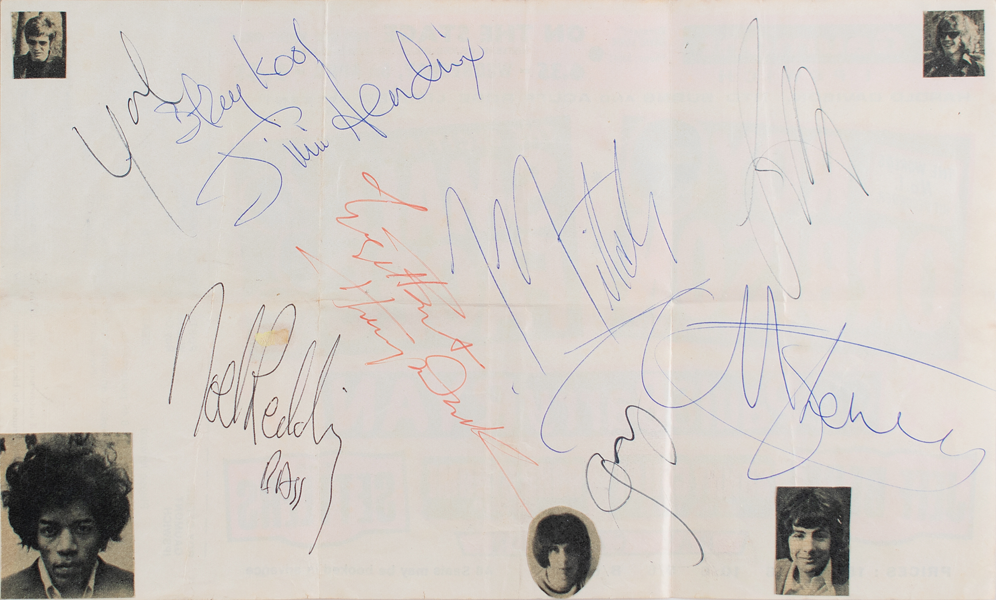 Accompanied by a detailed letter of provenance from the original recipient, in part: "When I was a teenager living in Pettistree, Suffolk, England, my parents allowed me to go to tour events put on at a couple of cinemas in the nearest large town?I had to buy tickets for the early show (there were usually two shows for each one-night stand) as the last bus left for home at 10.30pm and took an hour to get to Pettistree which was only about 15 miles away! This afforded me the opportunity to collect autographs between shows?The Yardbirds autographs were obtained by me as a member of their fan club on the 19th October, 1965, shortly after having no luck at the stage-door of the Gaumont, Ipswich on the 16th May, 1965. I did, however, manage to meet The Riot Squad (and, notably, Mitch Mitchell before he joined Hendrix, whose autograph I obtained). Jimi Hendrix appeared at The Gaumont Cinema on the 1st April, 1967 where Englebert Humperdinck was the special guest. Also featured were Cat Stevens, The Walker Brothers, The Quotations and others. I had forgotten my autograph book so grabbed a flyer for the next show from the box office and managed to get a lot of autographs on the back of it."